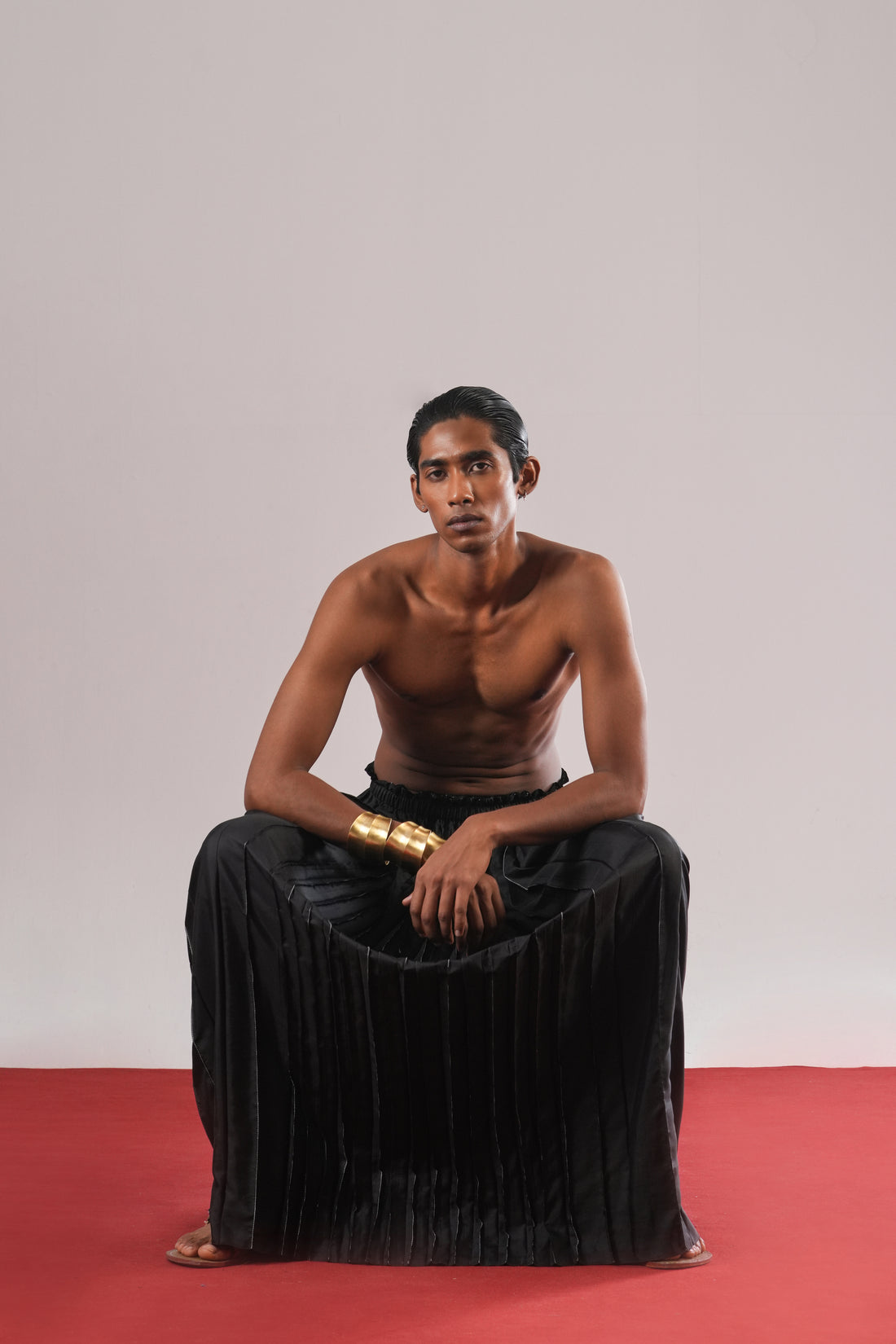 This flared silhouette reinterprets the traditional Kalidaar as a modular, trans-seasonal skirt. The textile collage...