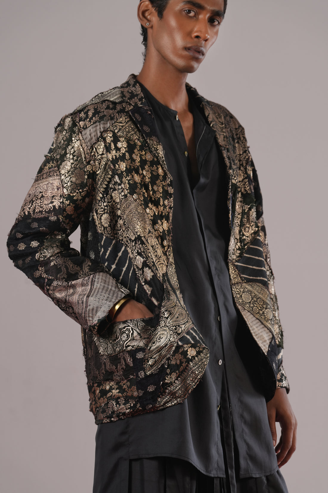 A tailored long trench coat meticulously patched in vintage brocade silks and handwoven tissue silk....