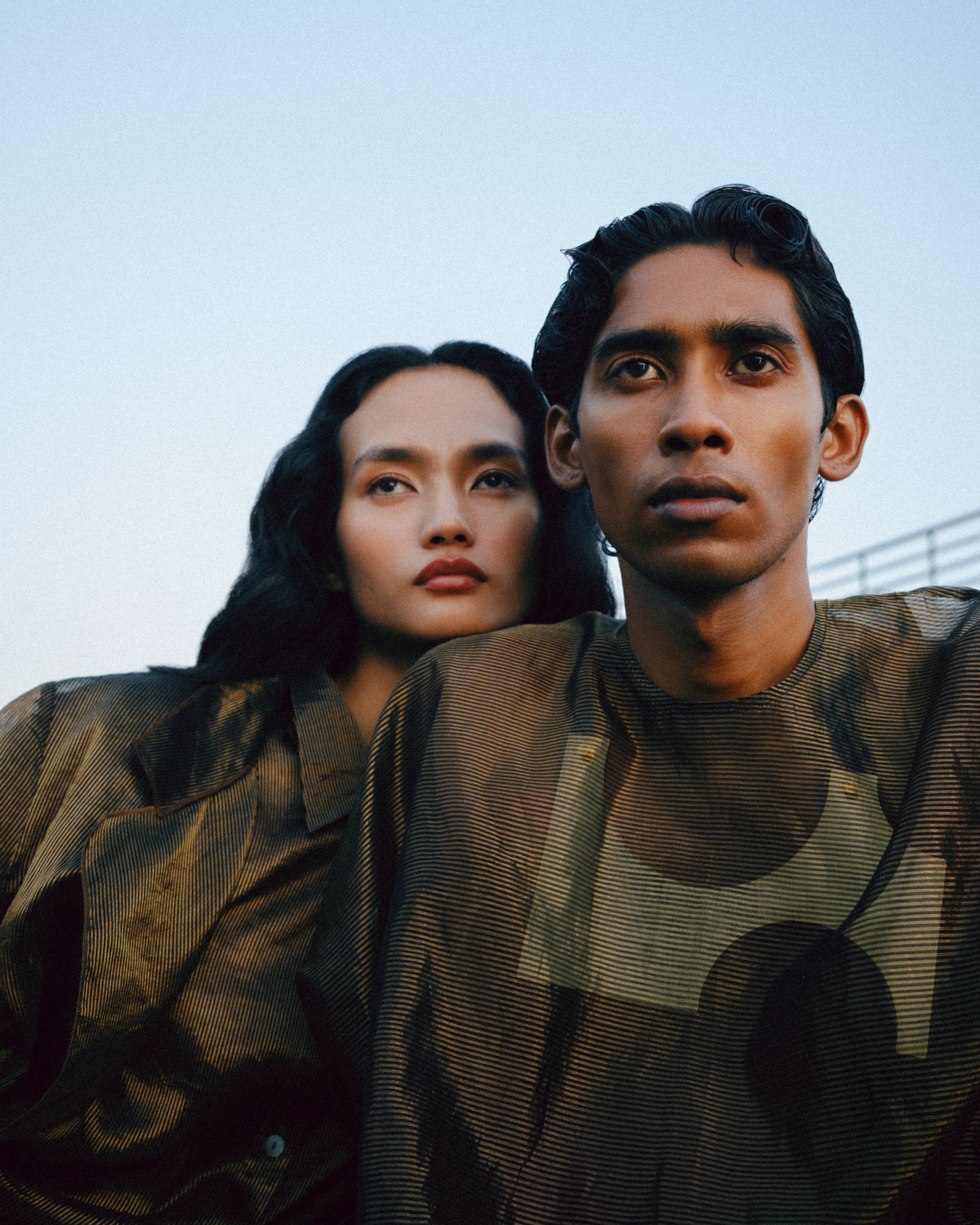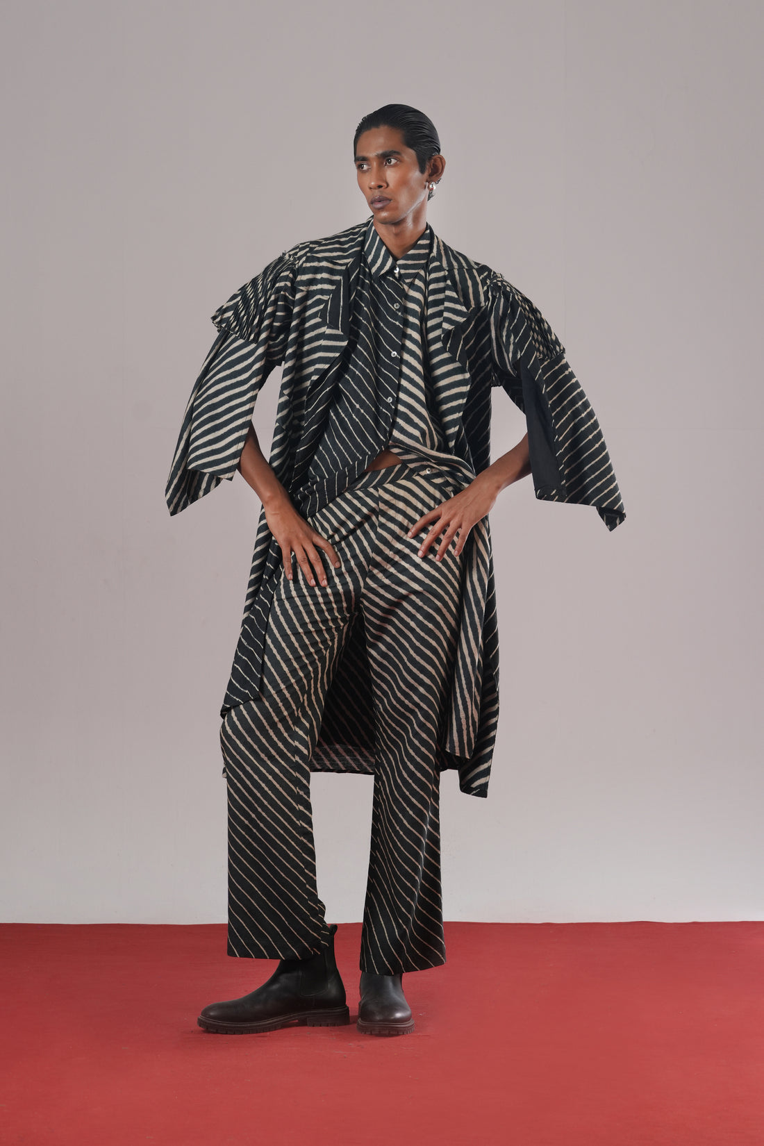 An oversized hoodie meticulously crafted in handwoven striped tissue silk — where comfort meets quiet...