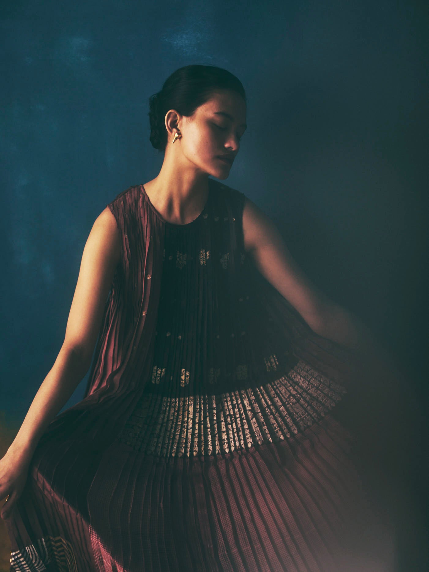 A block-printed and upcycled hand micro-pleated shift dress, patchworked with vintage brocade silk.Each panel carries...