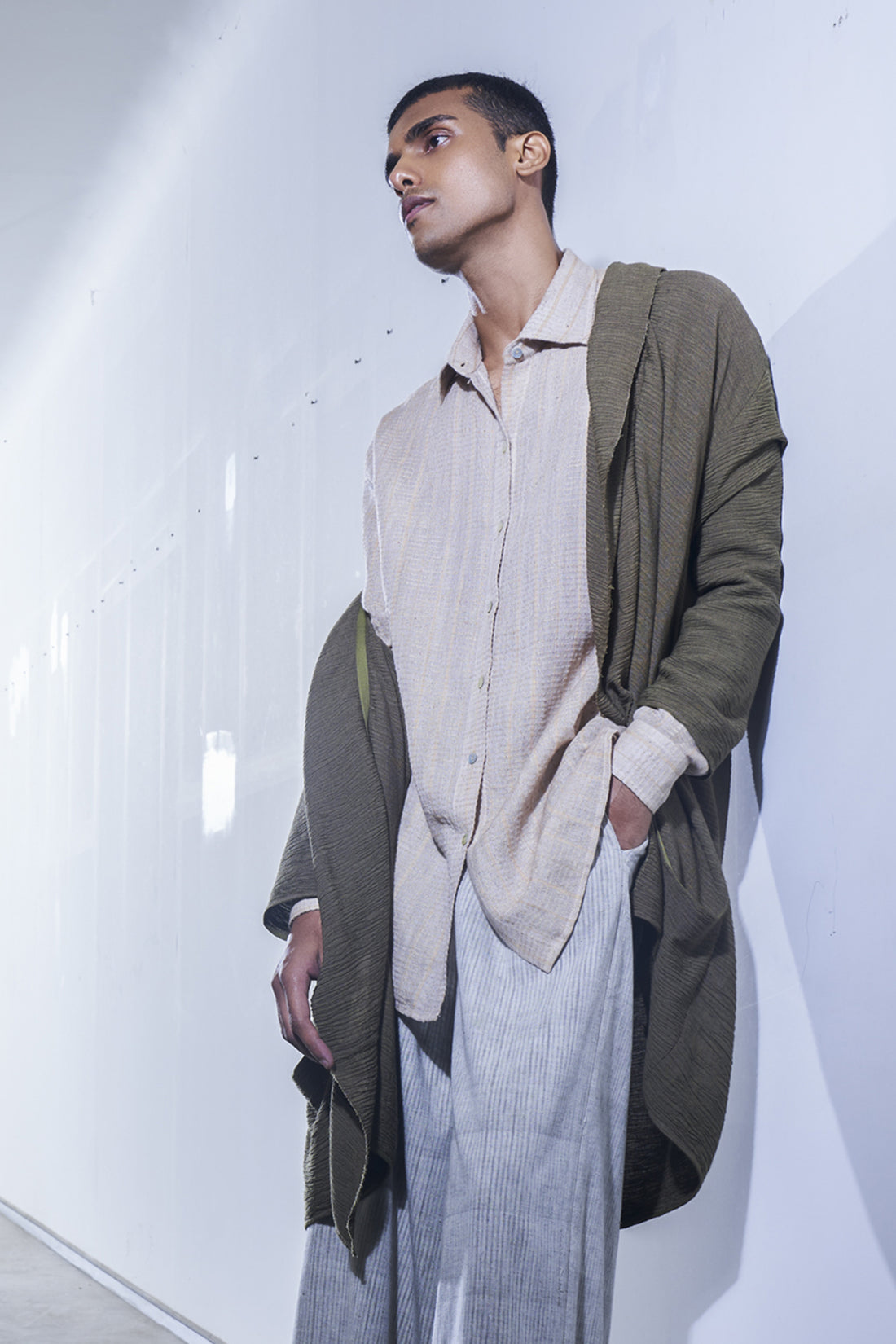 Tailored button-down shirt in textured handwoven organic cotton Wear tucked with pants for a complete...