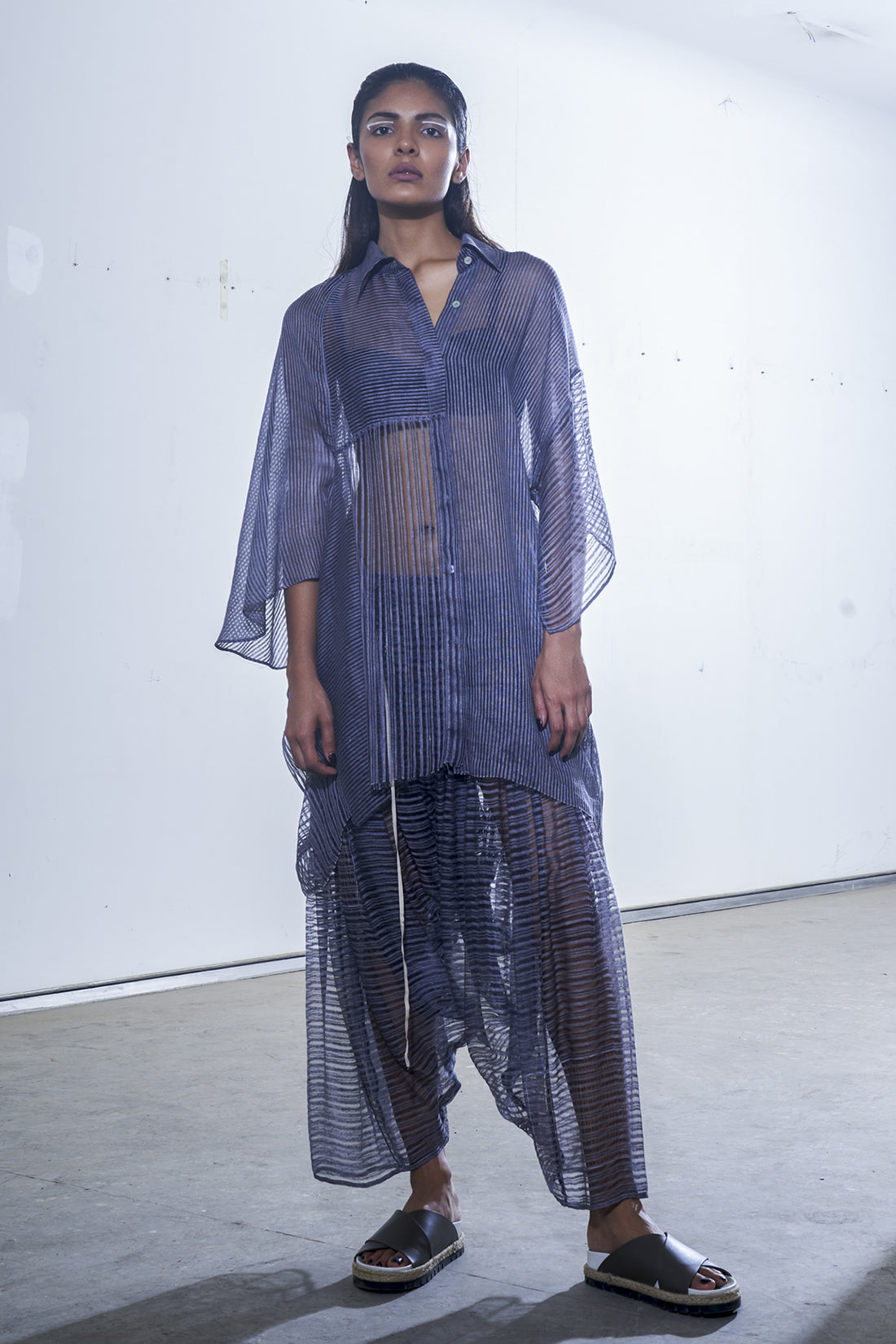 Blockprinted uneven hemline striped shirt in linen noil Wear over matching shalwar/ lounge pants for...