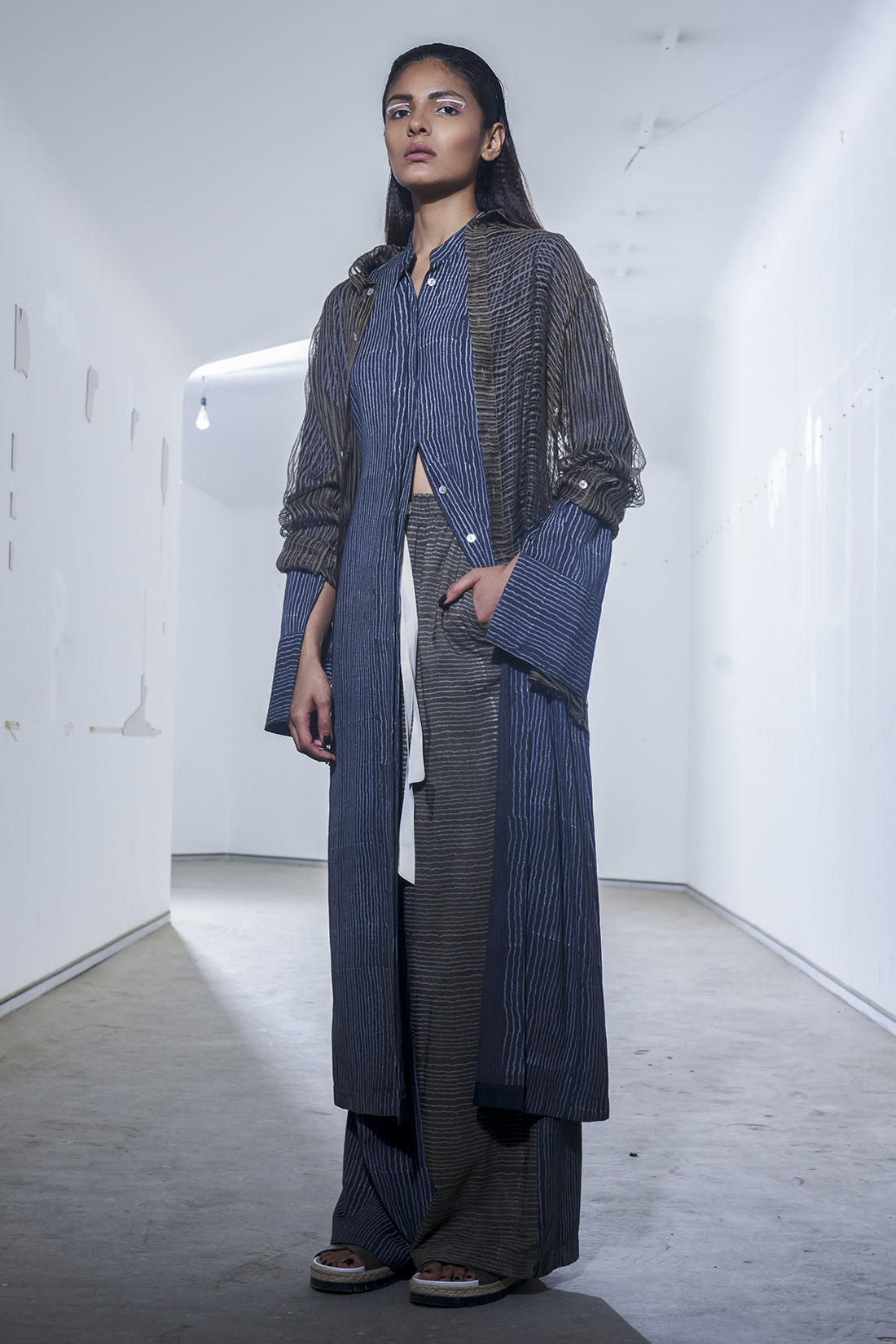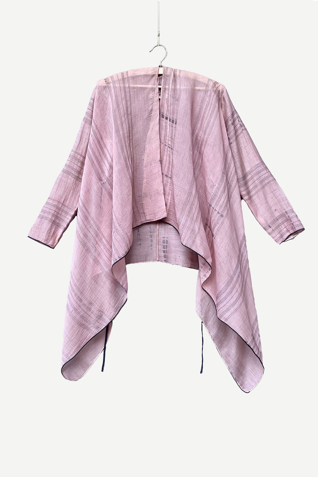 Easy, oversized jacket in textured handwoven organic cotton khes layer over a pair of tailored...