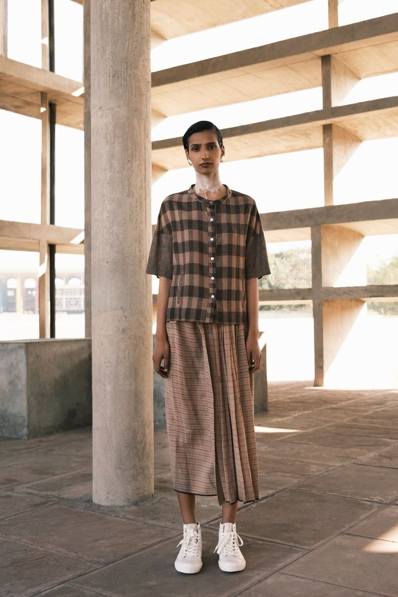 Flared pants in checkered handwoven organic cotton Style it with the shibori printed boxy slip...