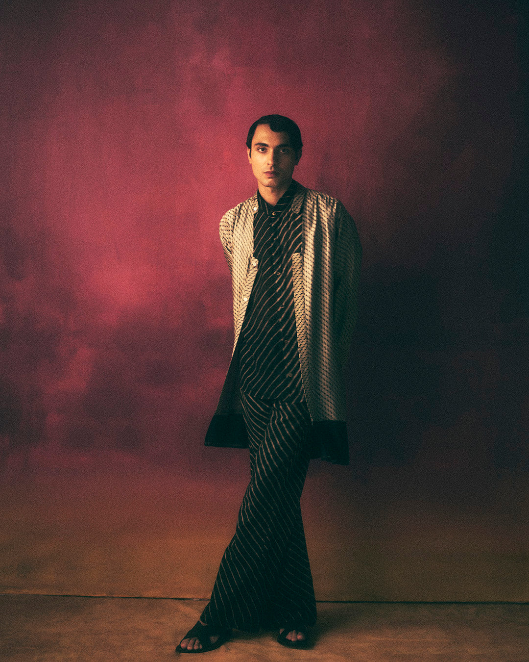 Relaxed farshi pajamas in handwoven zari kota doria. Style it with our echo dress and...