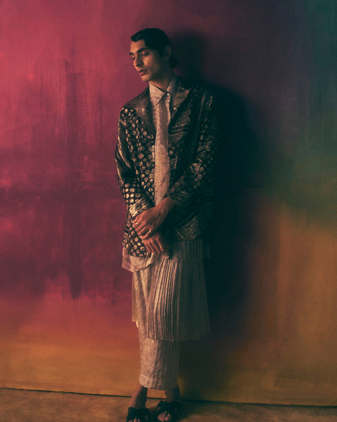 Upcycled flared micropleated pants in chanderi and brocade silk with gold zari stitch line details...
