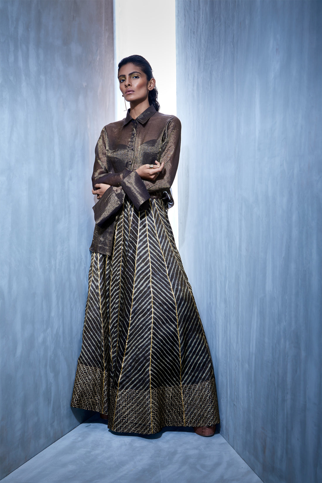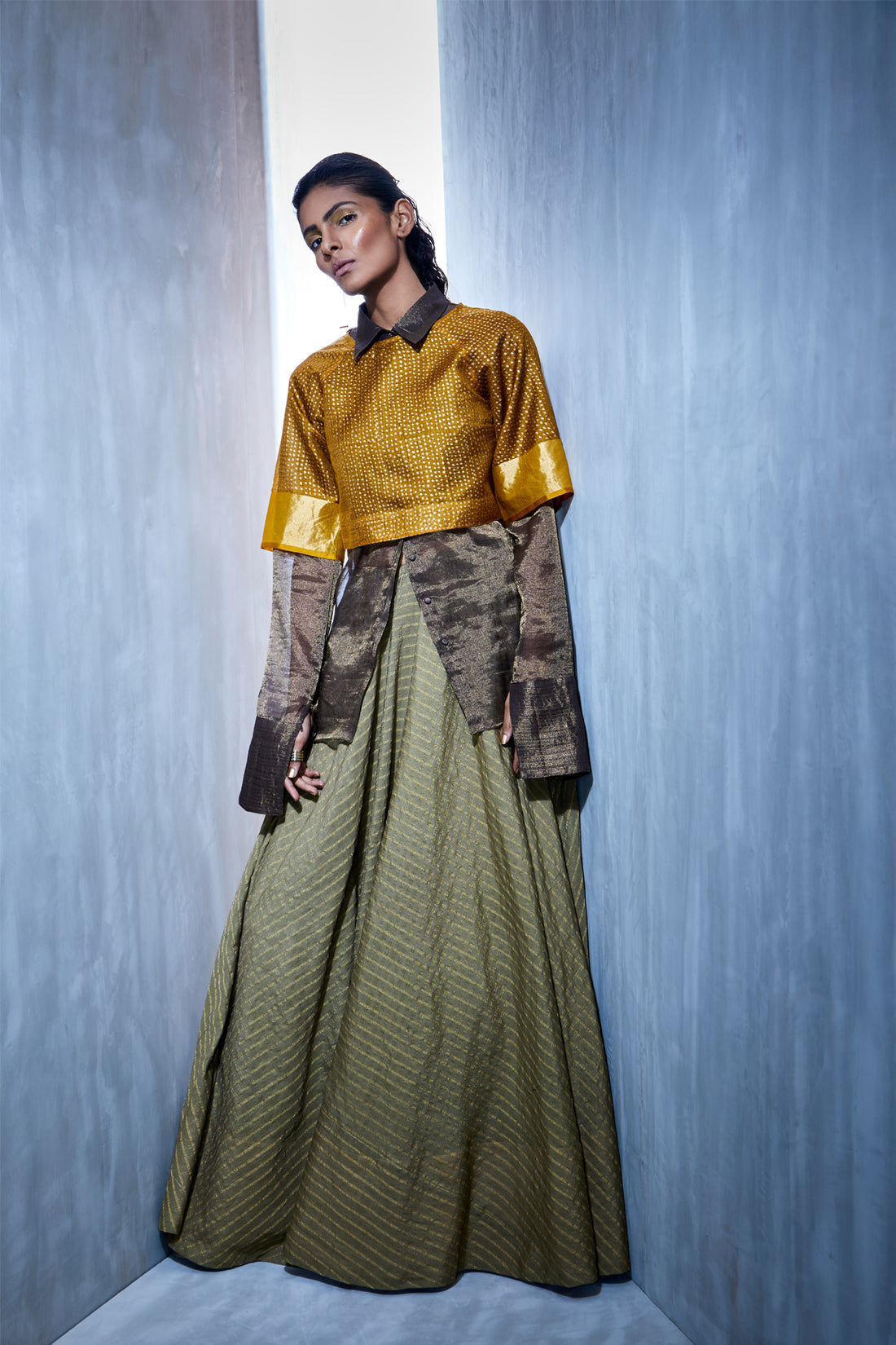 Full length flared lehenga in checkered zari cotton silkPair it with a a contrasting crop...