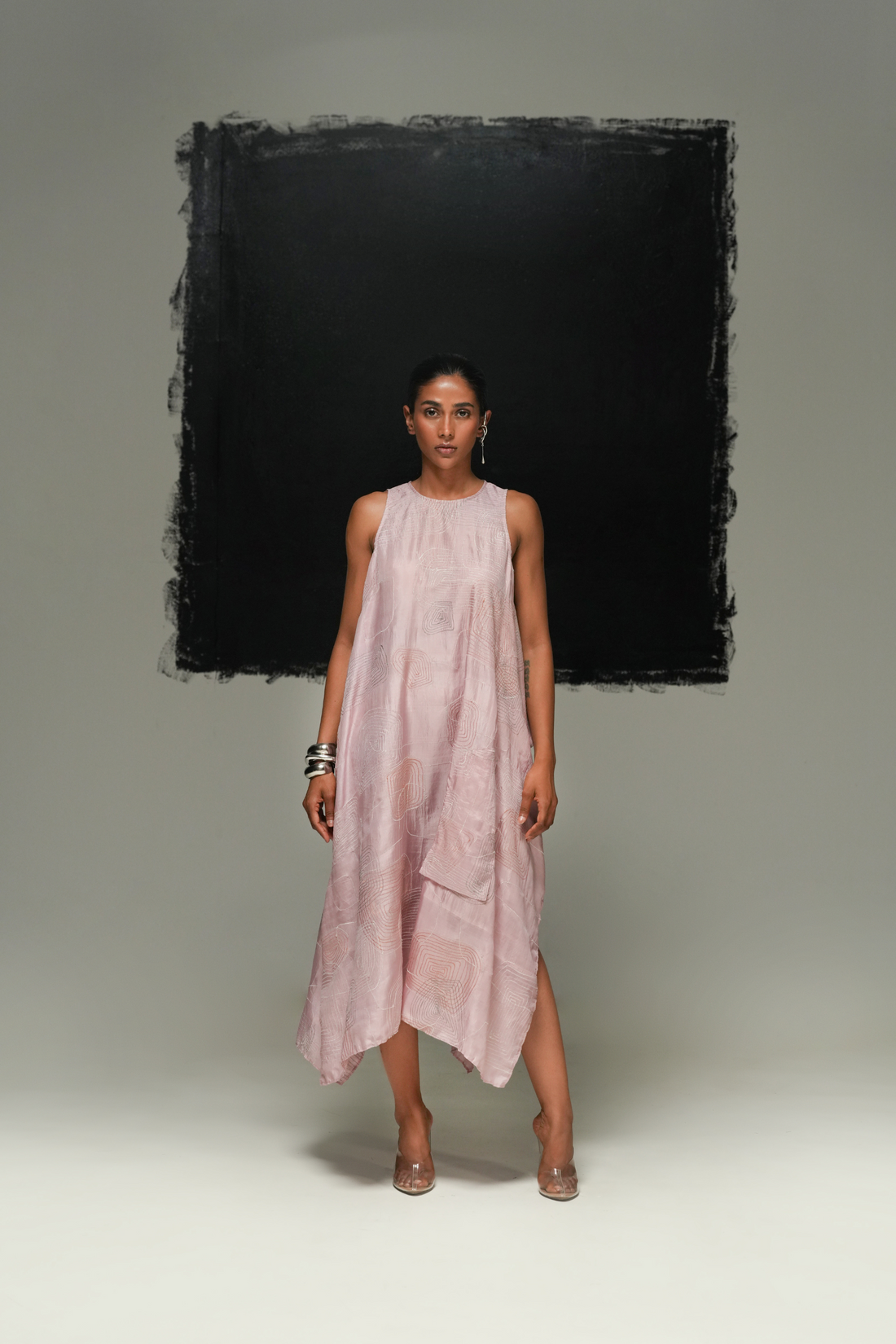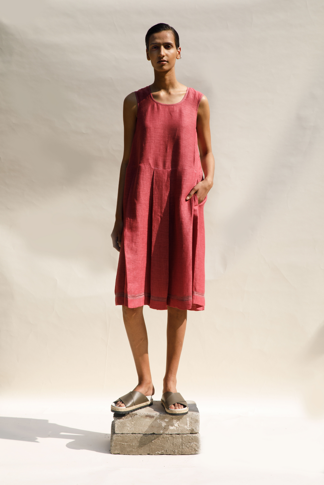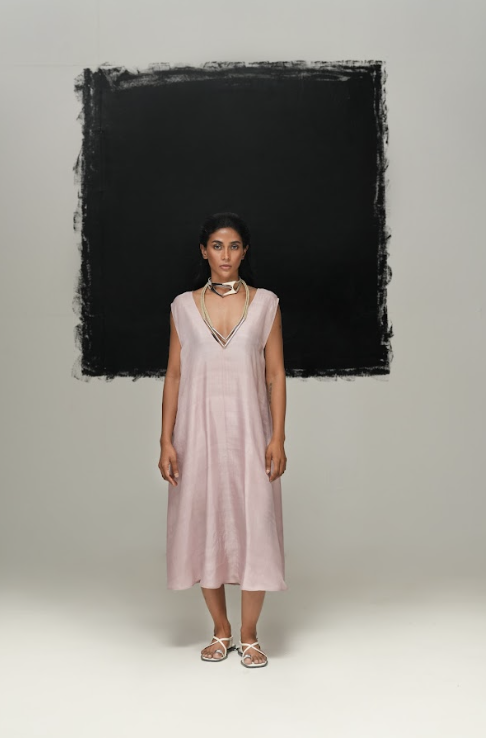 A dress crafted in hand-woven linen with the warm contrast of grey and pink hues...