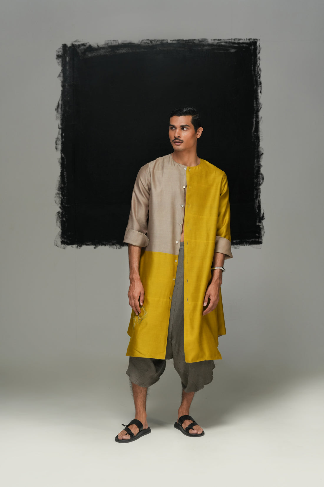 The sleeveless tunic is made with  handwoven striped tussar silk, which is naturally dyed in...