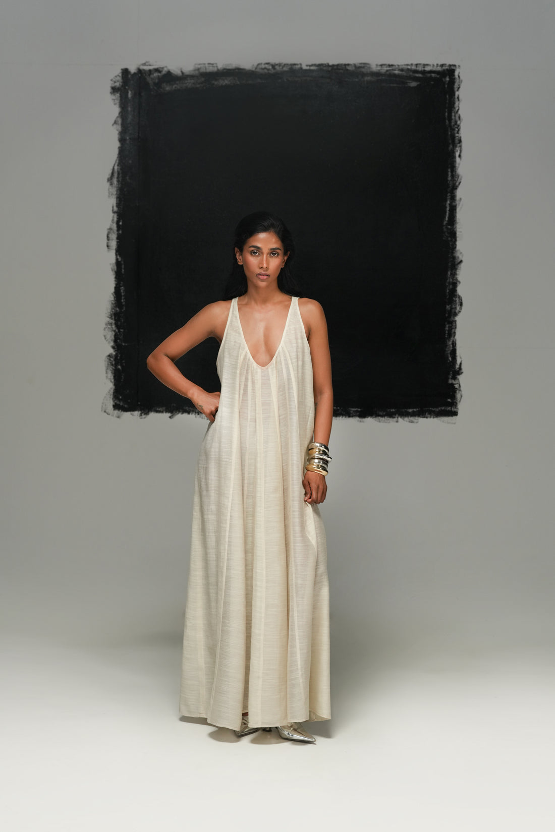 Sheer, sleeveless dress with inverted pleat in chanderi with jamdani buti wear as a dress or style...