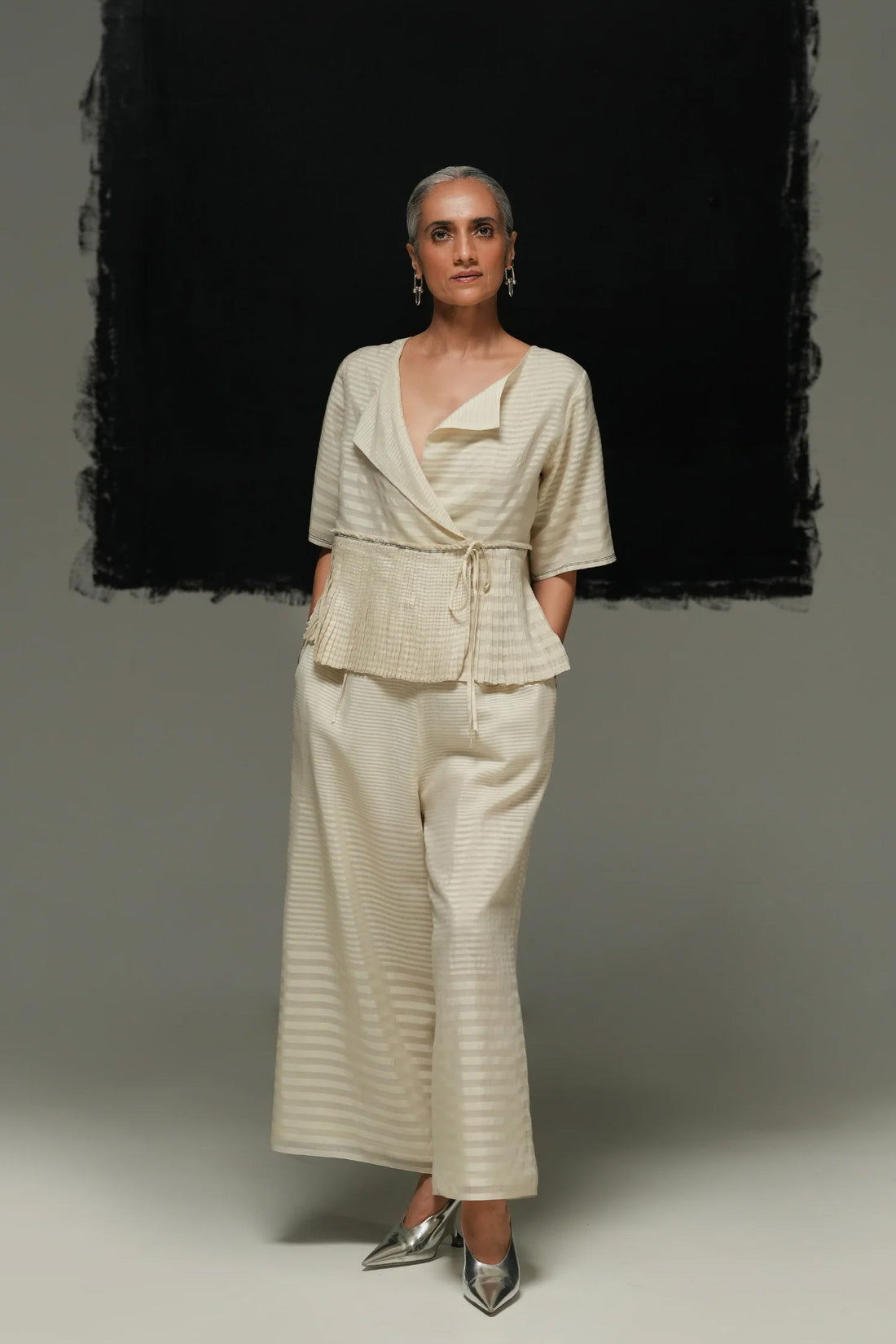 Hand micropleated wrap peplum top in handwoven maheshwari silk with kantha stitches holding the pleats....