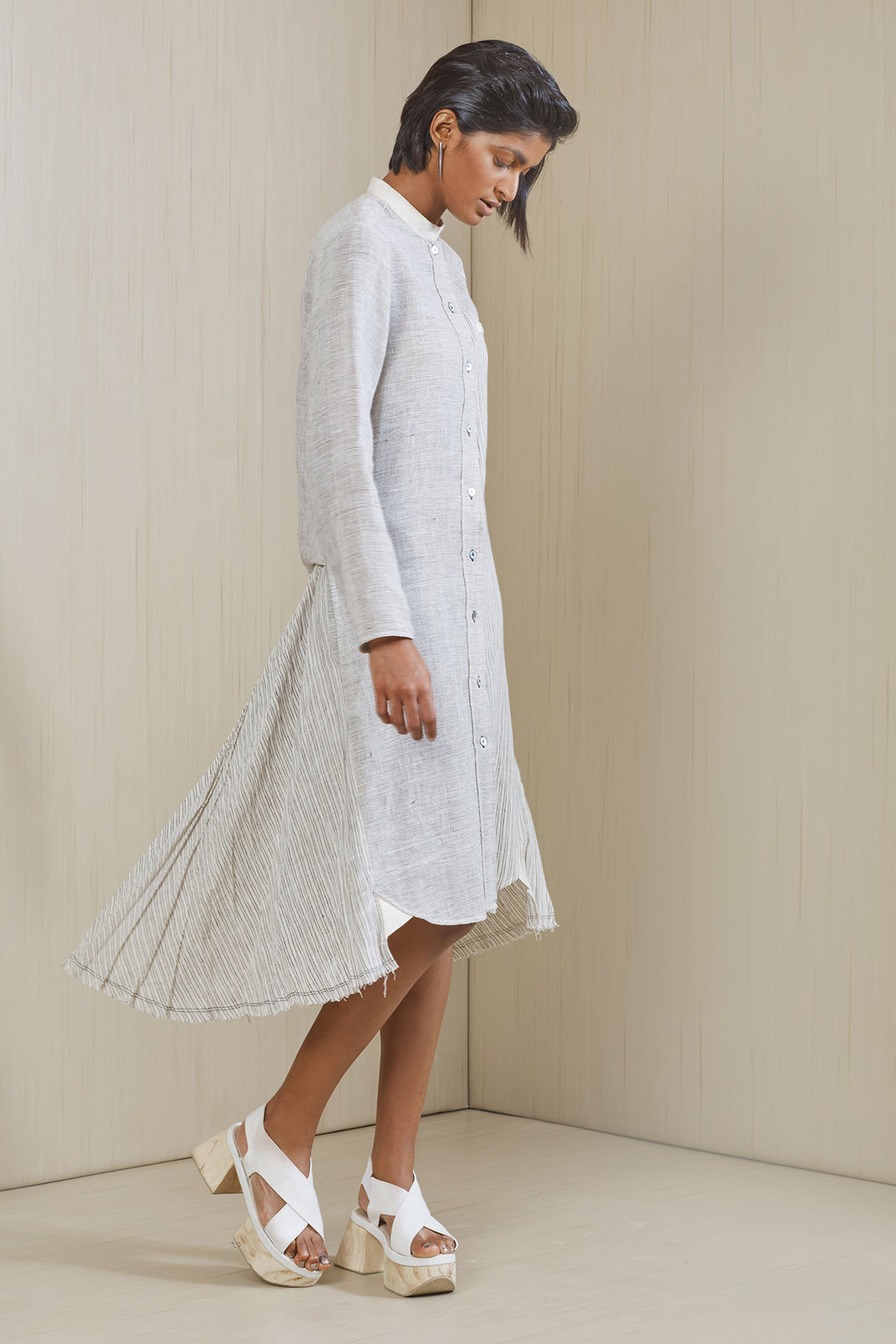 Easy shirt dress in handwoven organic striped cotton with handset pleats and kantha details Wear...