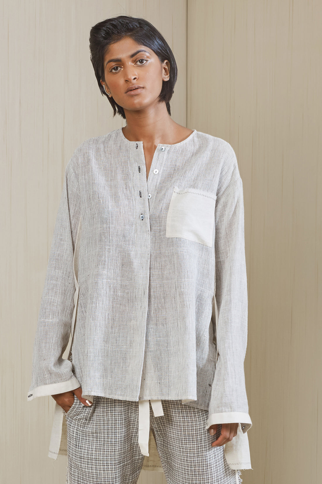 Easy shirt in cotton silk with back pockets and stitch line details adding texture Wear...