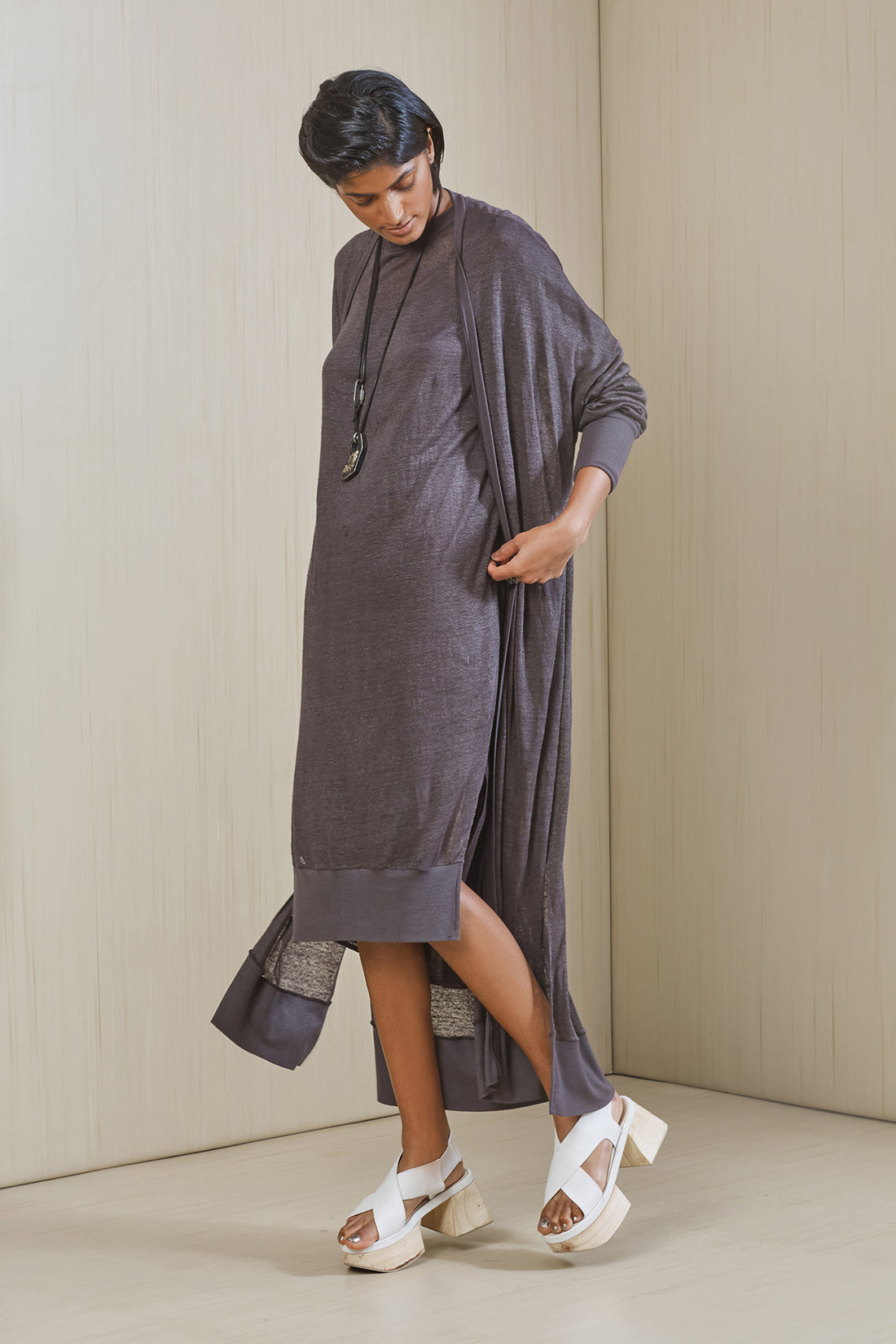 Asymmetric dress in textured cotton with back button details and kantha stitchesWear as is or...