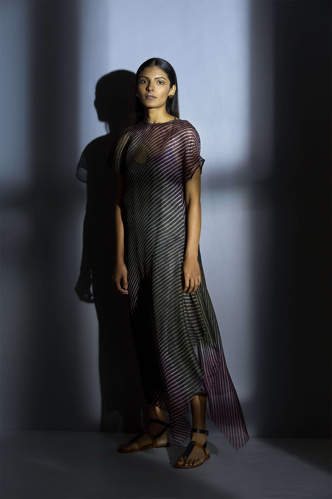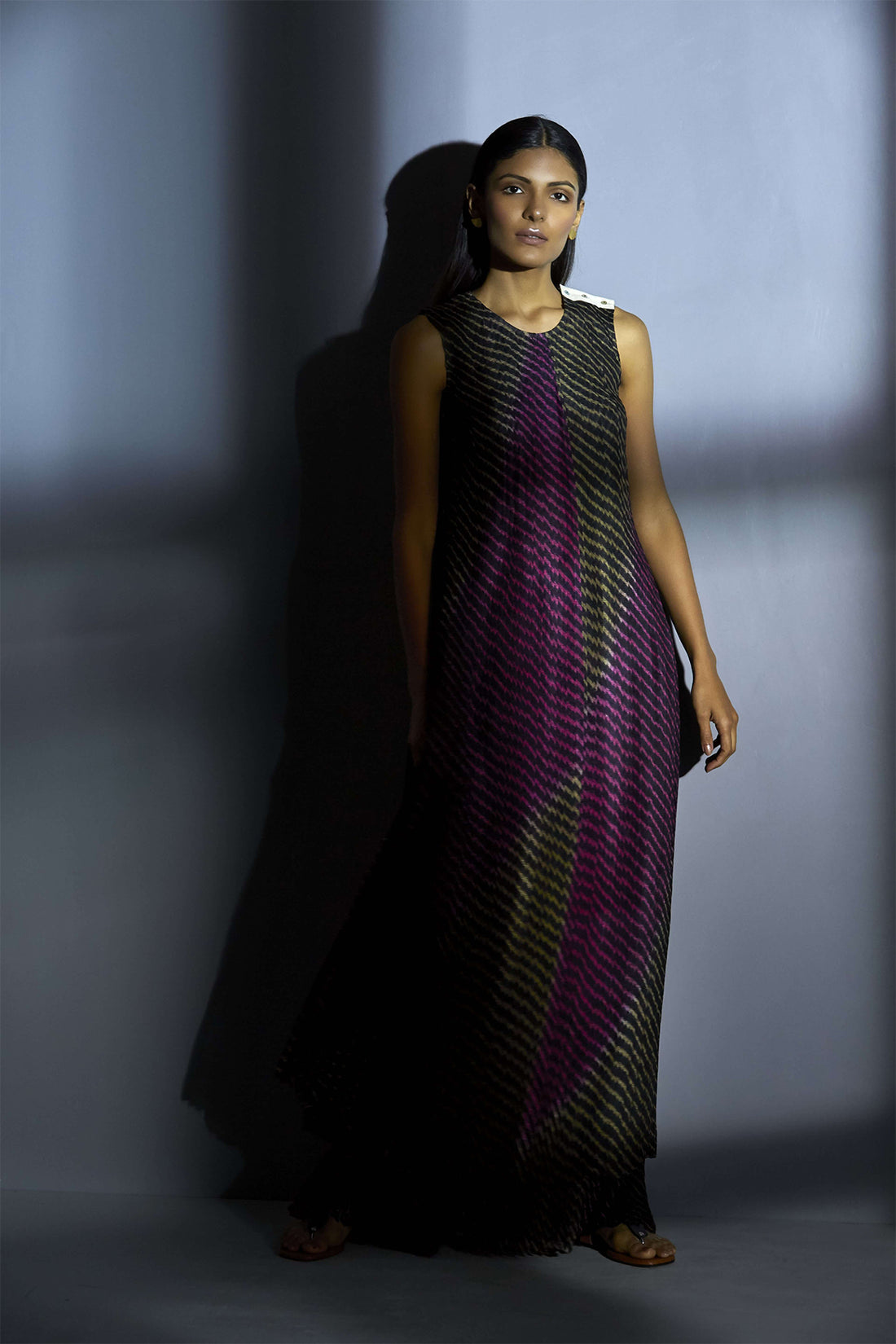 Micro pleated column dress in leheriya printed kota silk with kantha stitches holding the pleats...