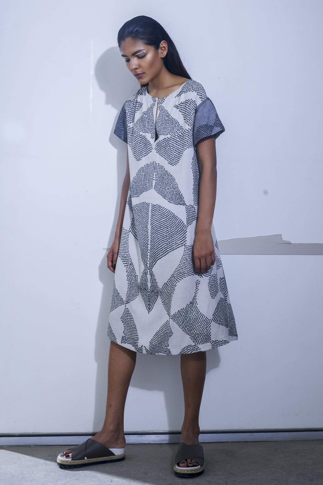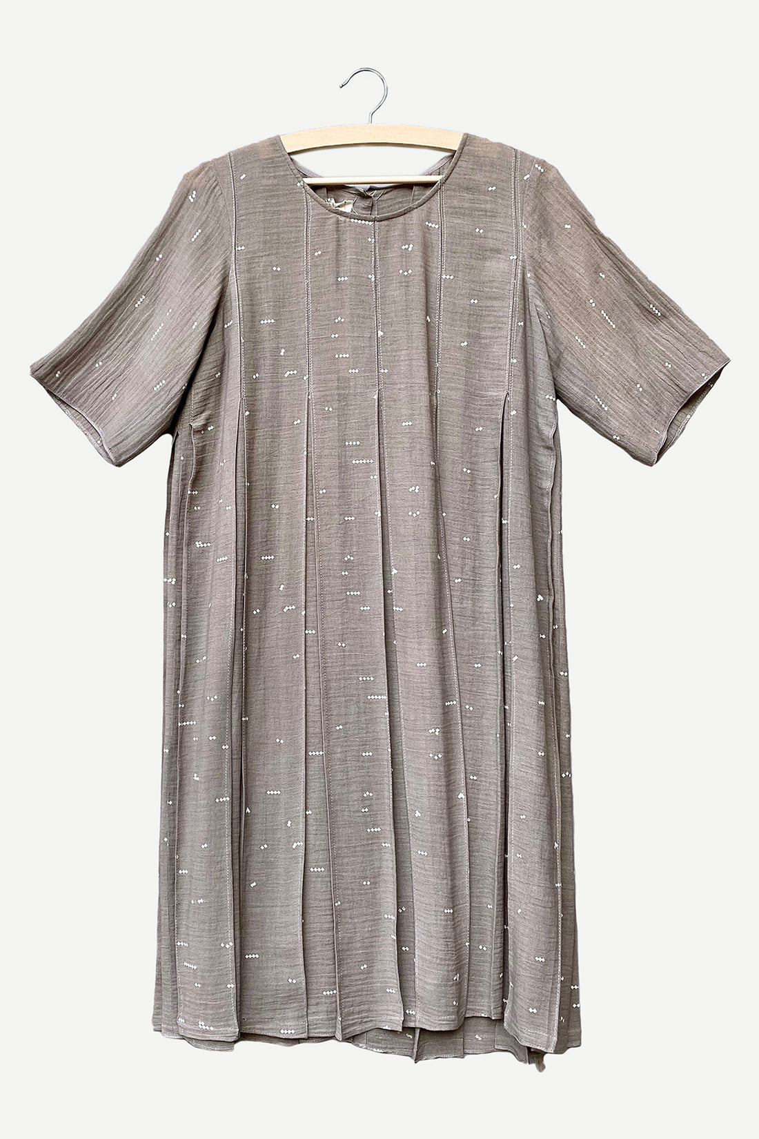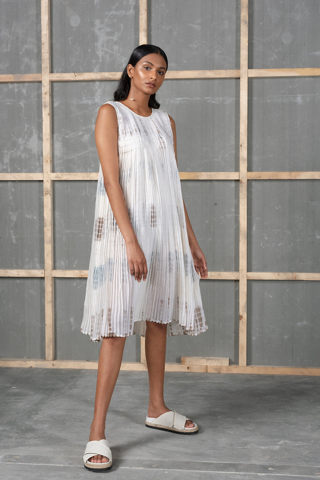 Hand micro-pleated shift dress in hand tie and dye kota cotton with kantha stitches holding...
