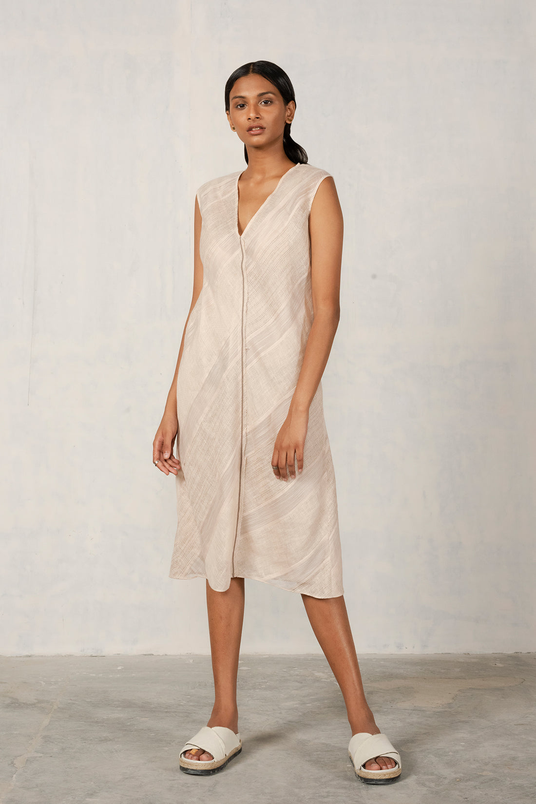 Bias shift panelled dress in linen & striped silk cotton with stitchline details adding texture...