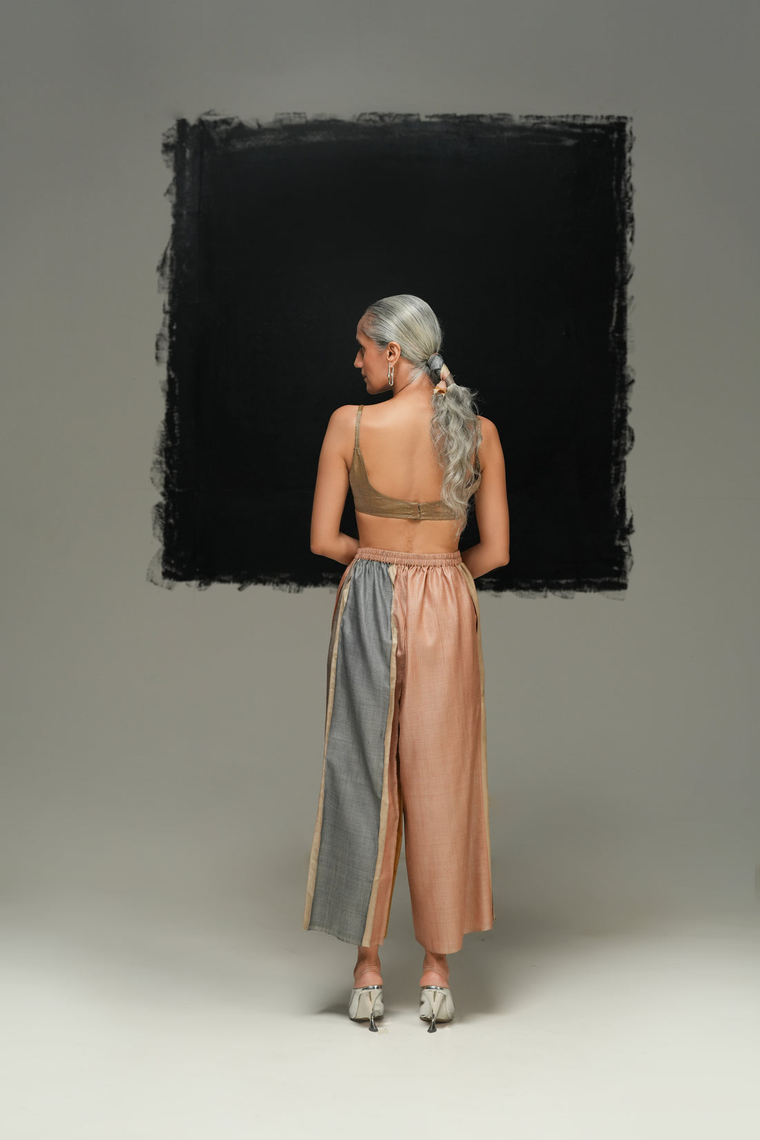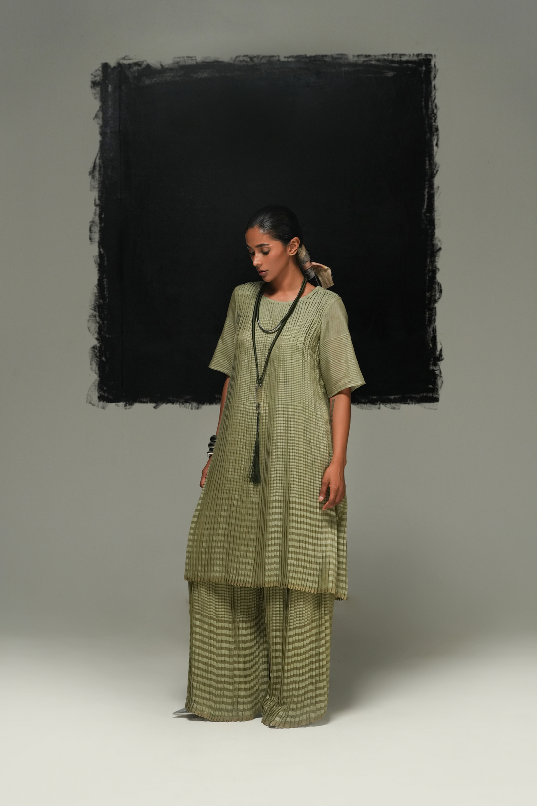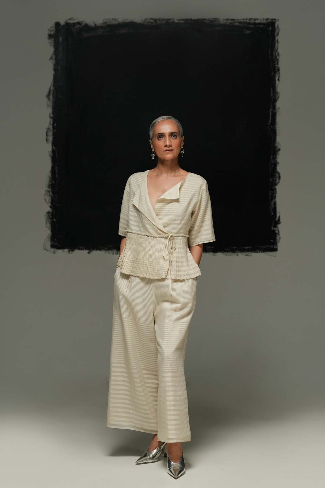 Hand micropleated pants in handwoven chanderi silk with kantha stitches holding the pleats wear with...