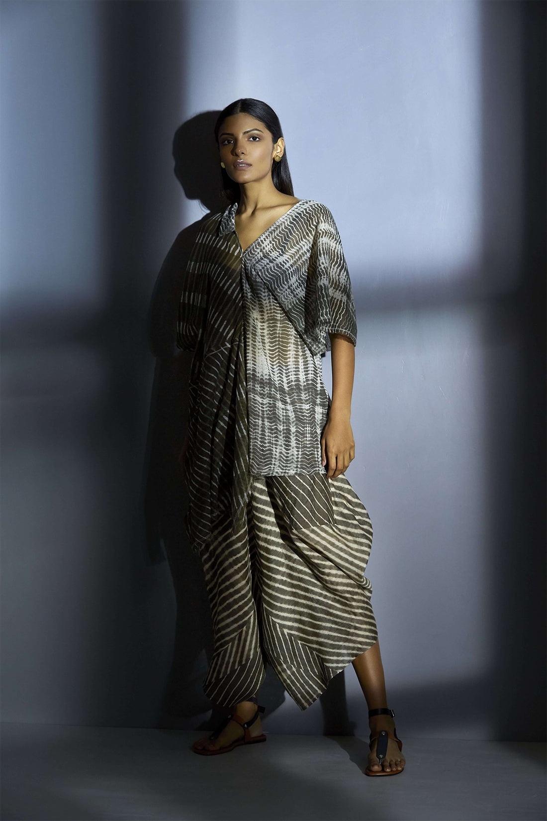 Panelled assymetric top in shibori printed hand tie dyed kotaCottonWear with easy leheriya print lounge...