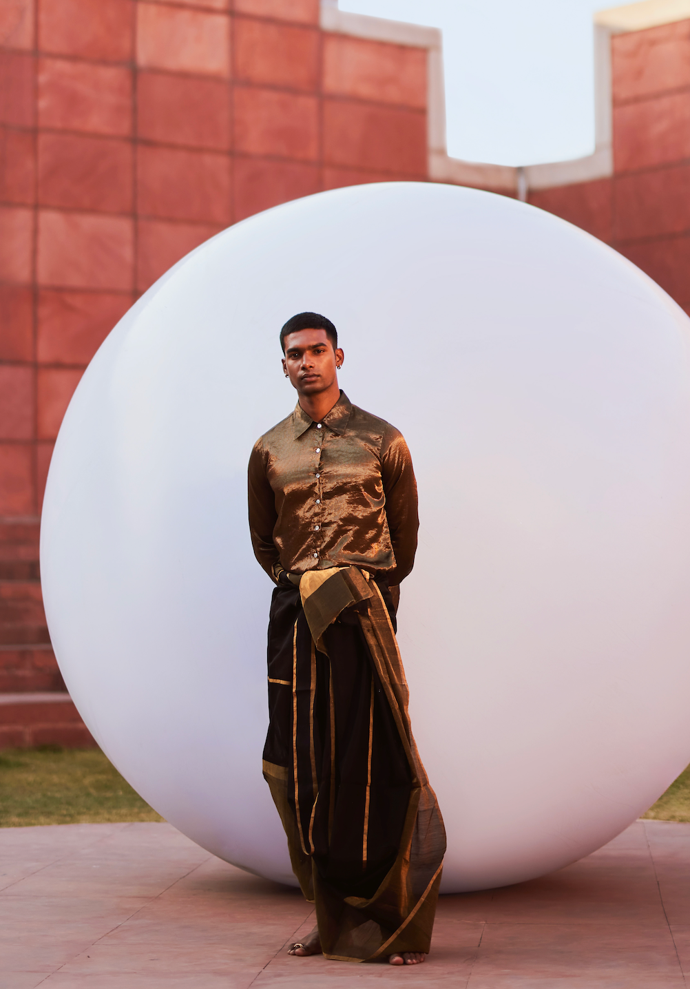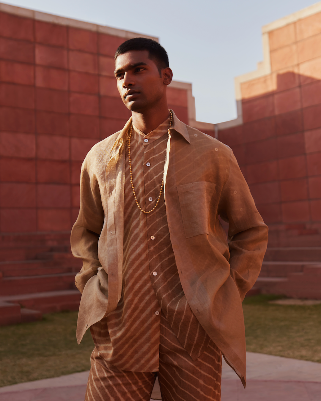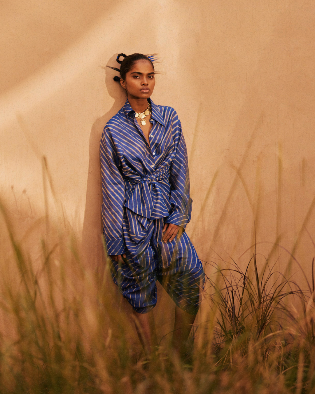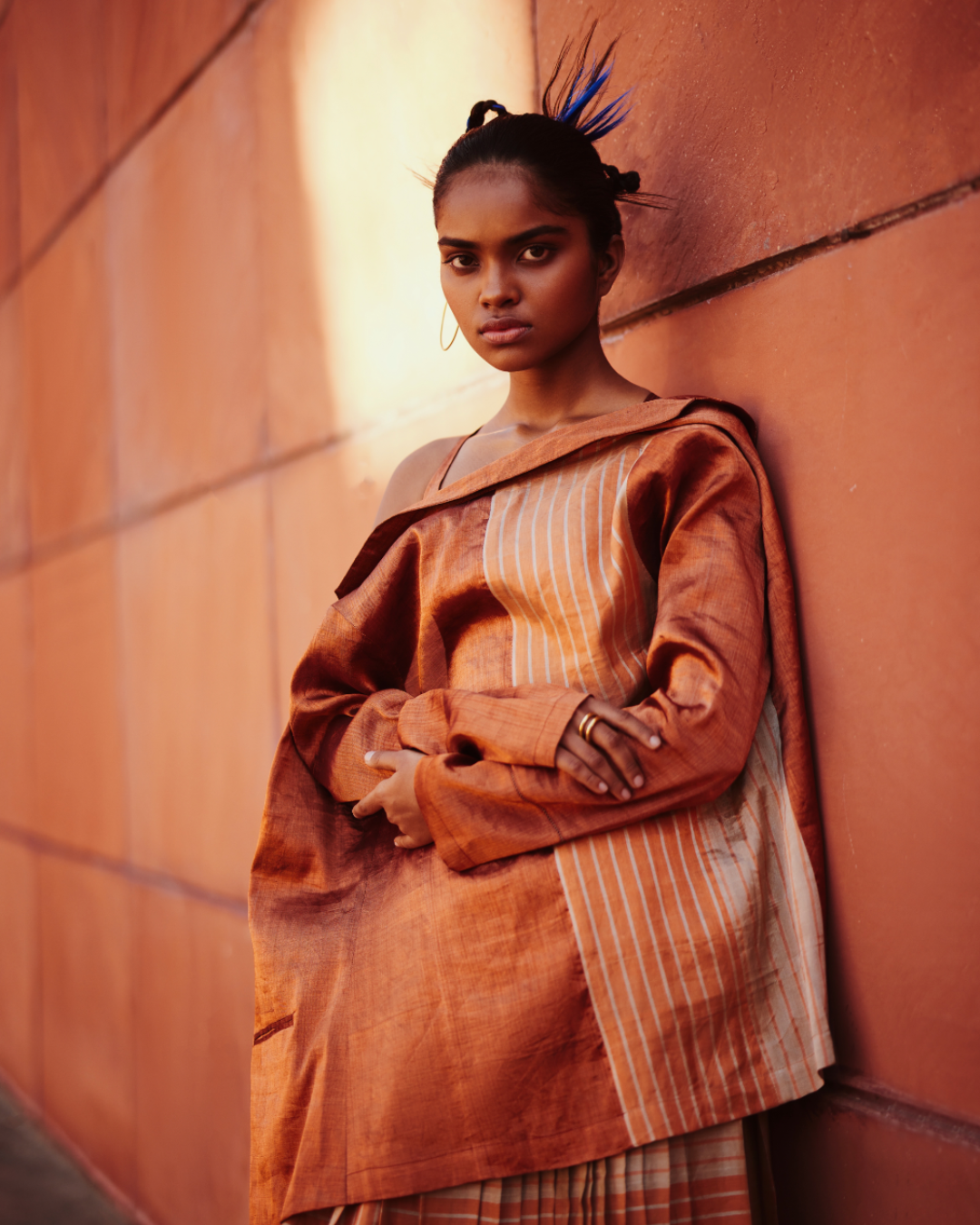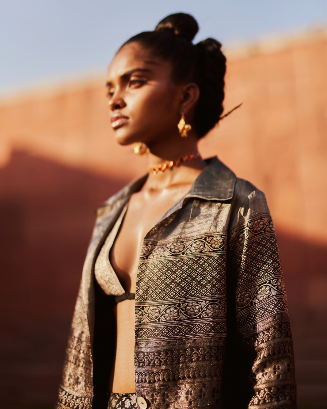 Held in every breath, Prāna is the primordial energy that connects all life; both macrocosmic and microcosmic. In this collection, ancestral heirlooms are reimagined as contemporary silhouettes, breathing new vitality into brocades, silks, and handwoven textiles. Intuitive and elemental, Prāna draws from the consciousness of the Vedas and the restorative wisdom of indigenous craft, where movement, texture, and colour become quiet meditations on presence.