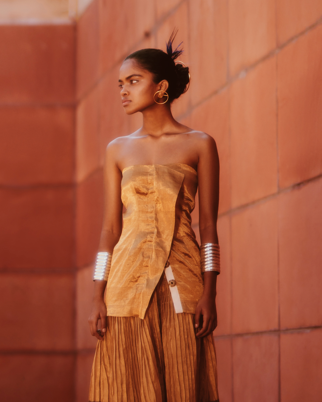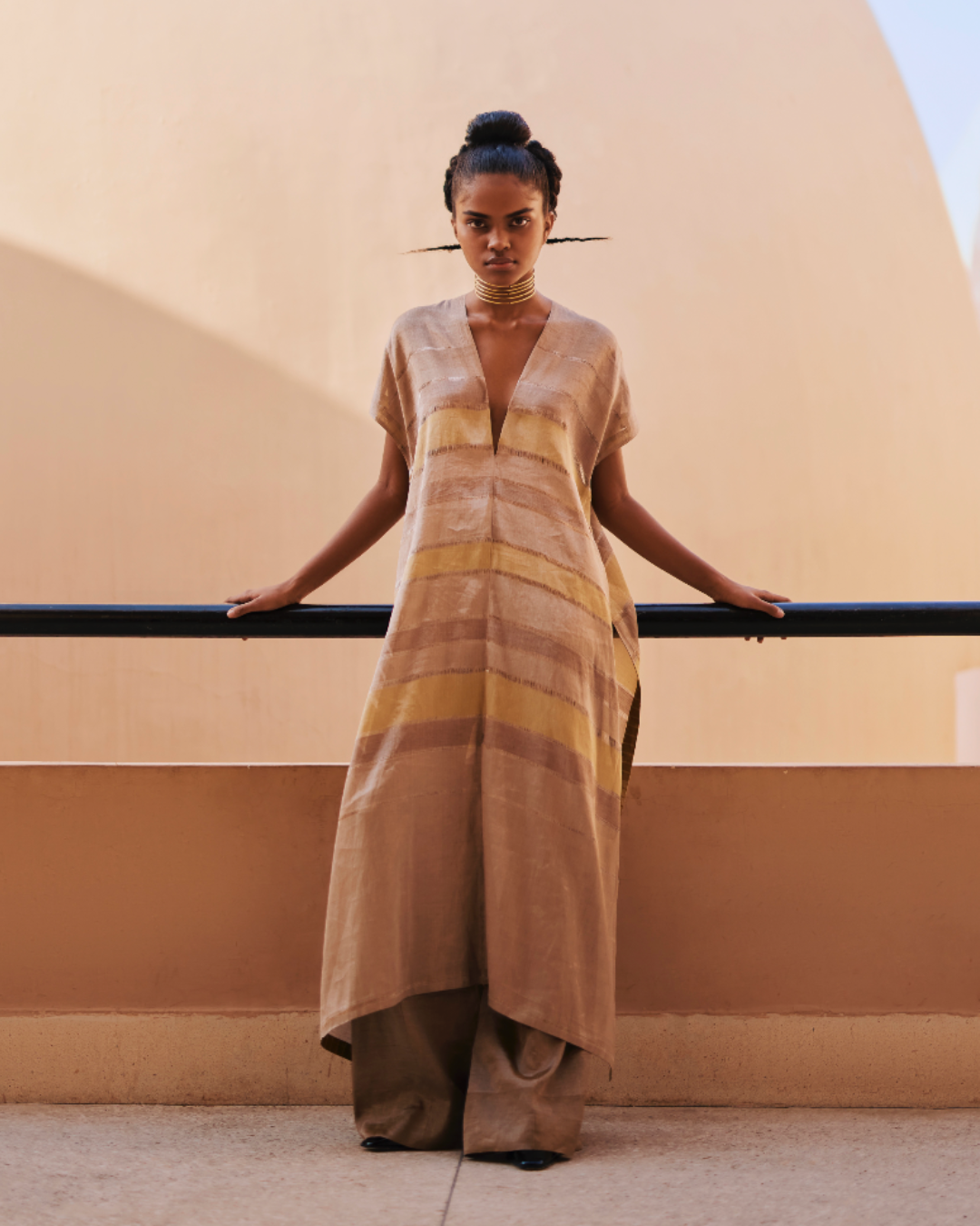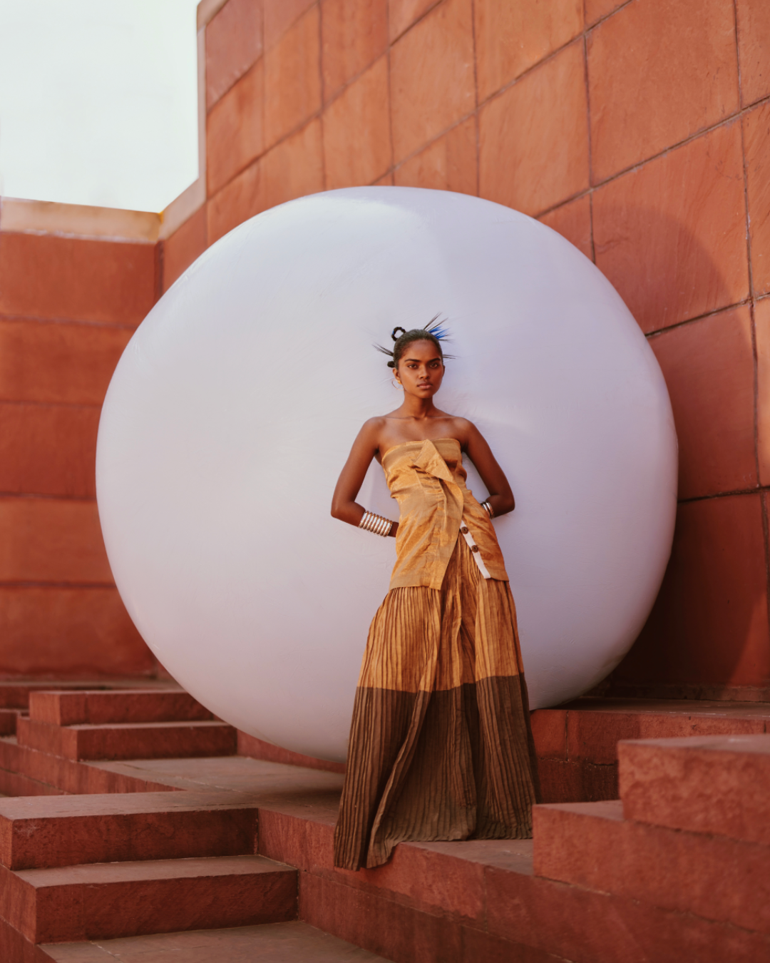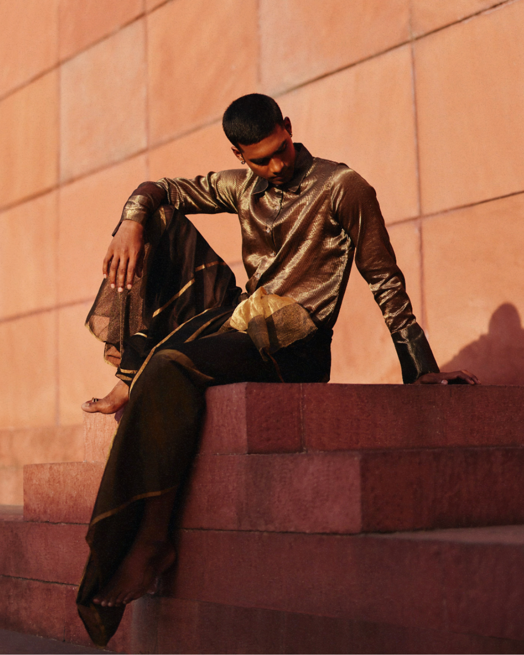 Held in every breath, Prāna is the primordial energy that connects all life; both macrocosmic and microcosmic. In this collection, ancestral heirlooms are reimagined as contemporary silhouettes, breathing new vitality into brocades, silks, and handwoven textiles. Intuitive and elemental, Prāna draws from the consciousness of the Vedas and the restorative wisdom of indigenous craft, where movement, texture, and colour become quiet meditations on presence.