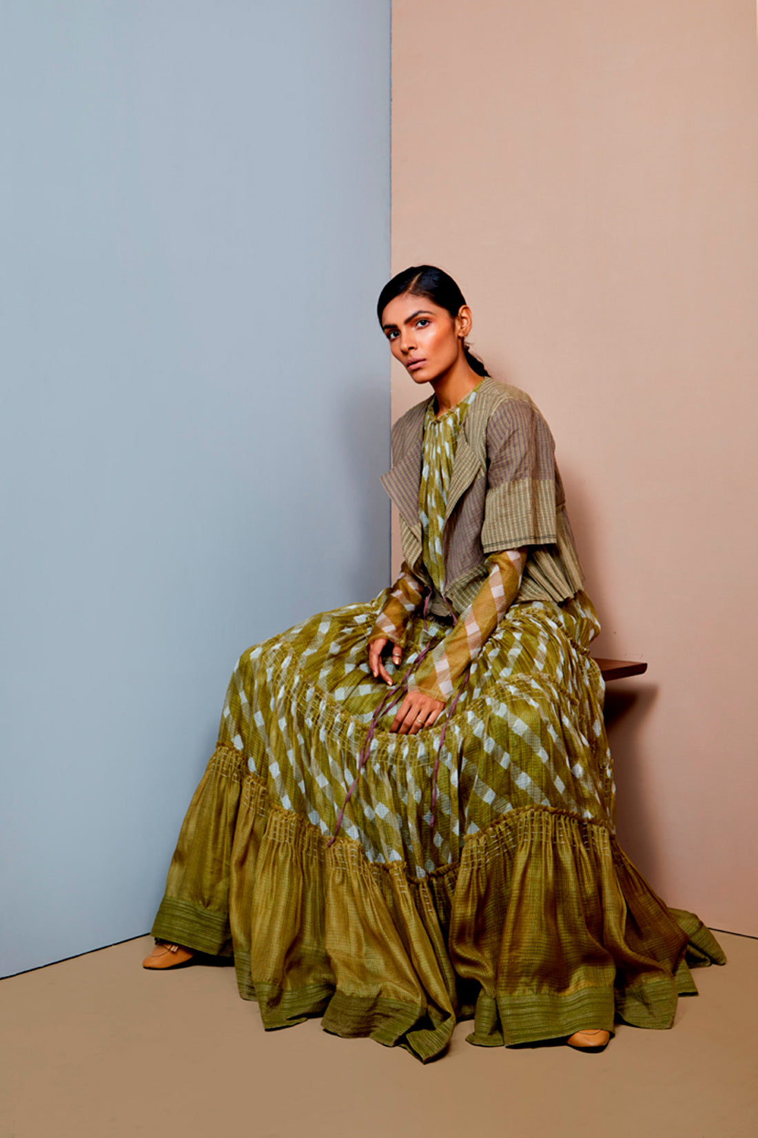 Flowy, hand tucked tiered tent dress in leheriya printed kota silk wear as is or...