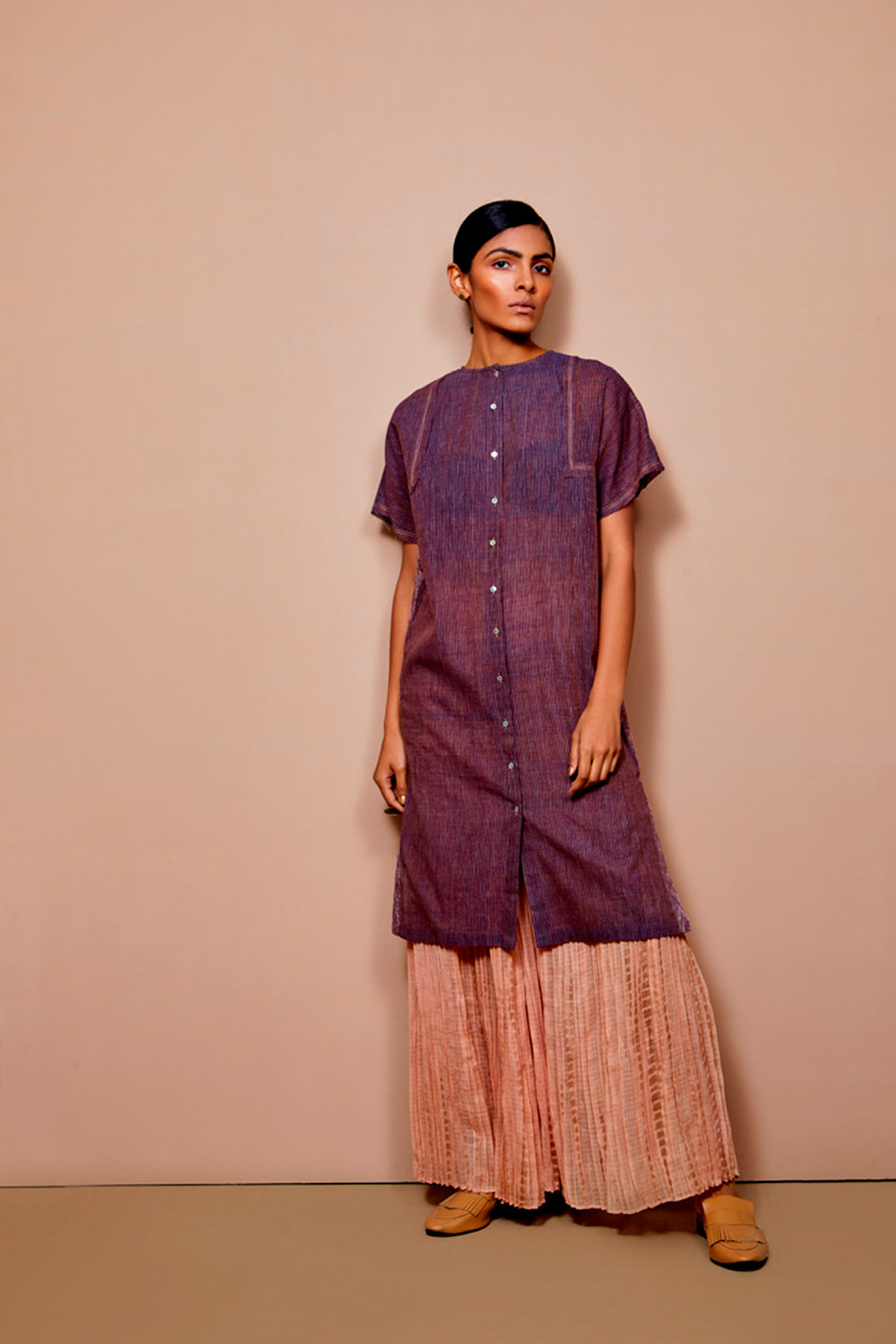 Asymmetric dress in textured cotton with back button details and kantha stitchesWear as is or...