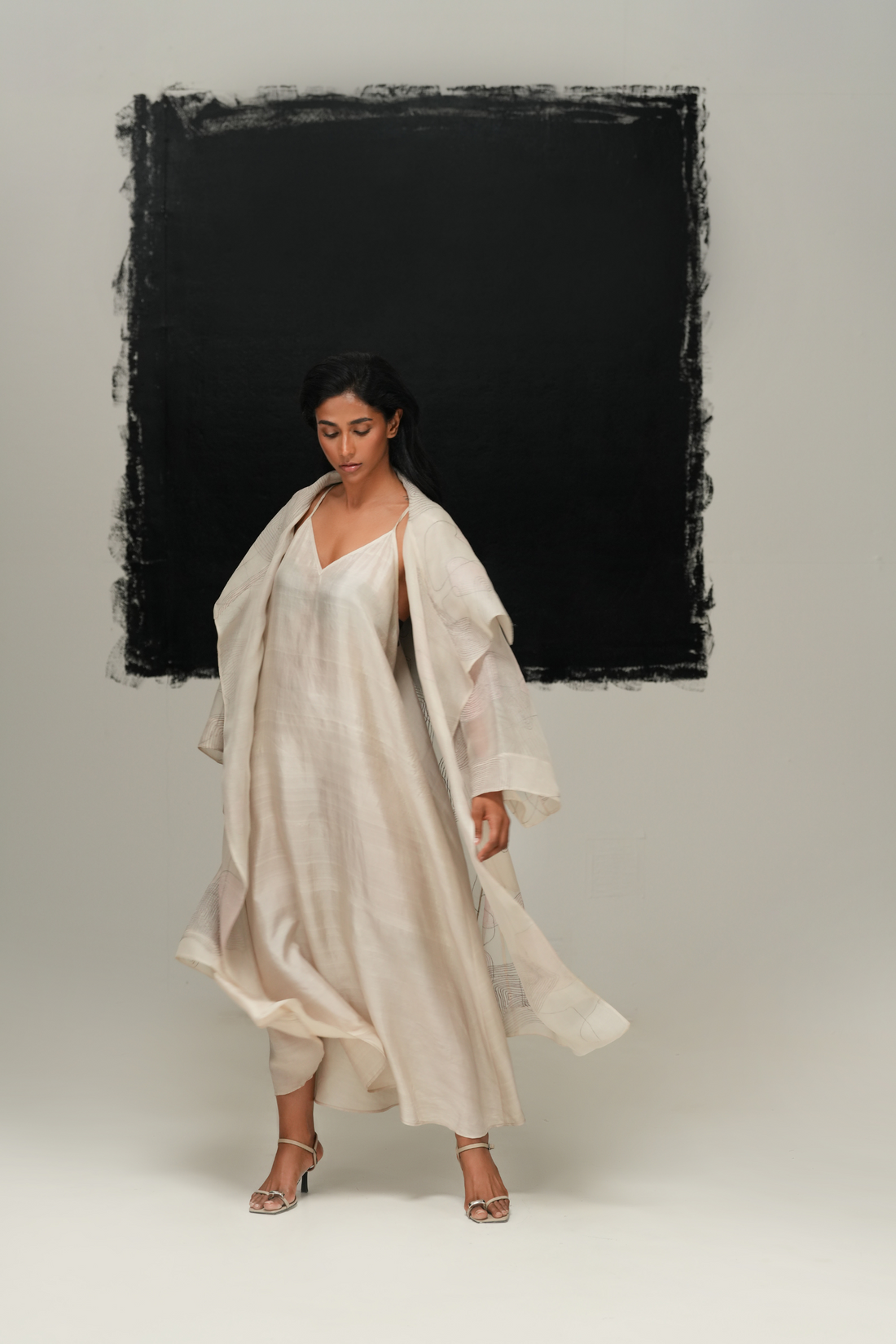 Sleeveless flowing dress inspired by nature’s quiet beauty. crafted in a blend of tussar and...