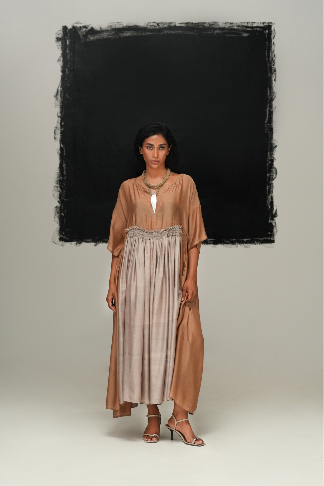 Relaxed, breezy dress crafted in mulberry silk with the warm grey & cinnamon grey contrast....