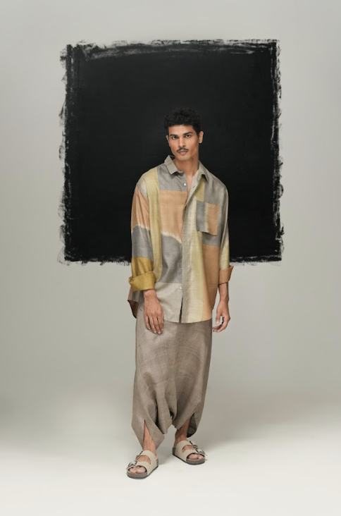 Oversized easy shirt in naturally tie-dyed and hand painted tussar silk woven and dyed in...