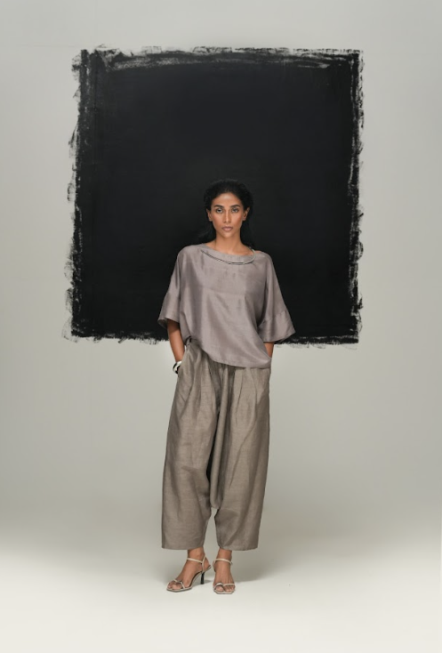 Handwoven mulberry silk top in steel grey hue. Wear it as is for understated charm...