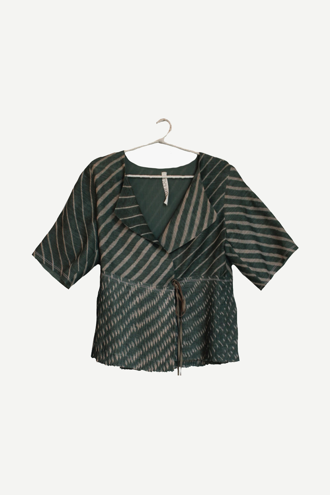 Micro-pleated, tie-up peplum, in shibori printed linen noil with kantha stitches holding the pleats Pair...