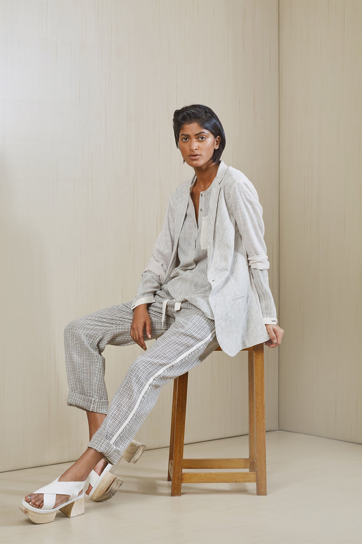 Relaxed comfort pants with a drawstring in checkered handwoven organic cotton