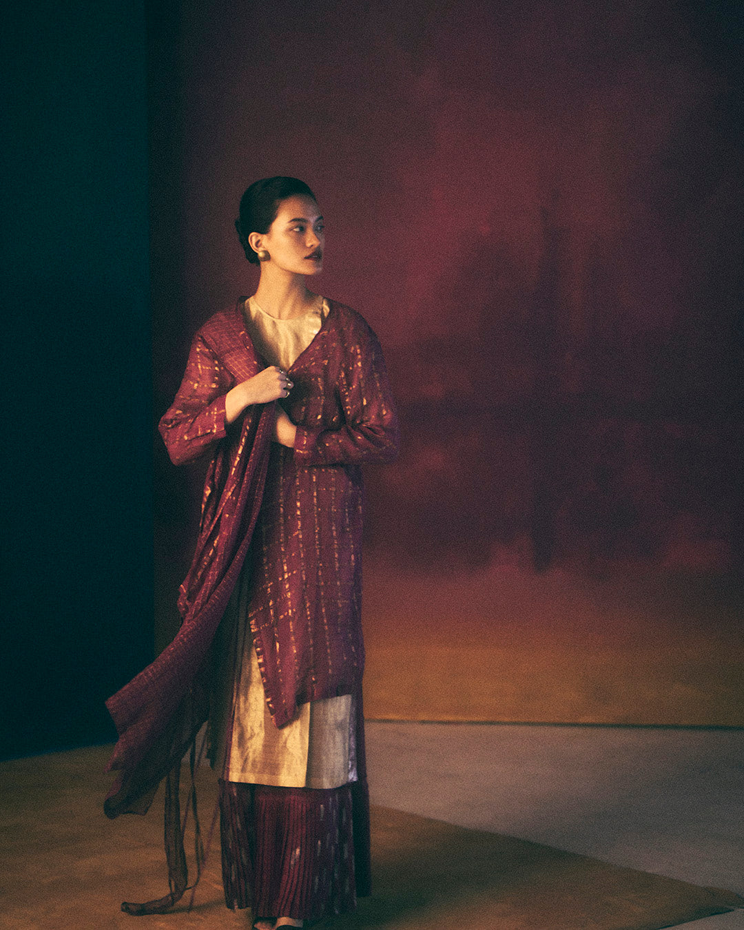 Upcycled flared micropleated pants in chanderi and brocade silk with gold zari stitch line details