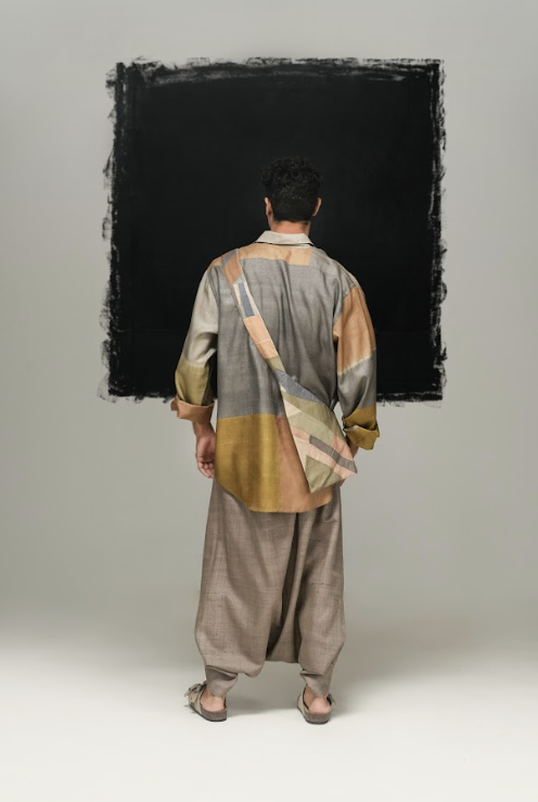 Oversized easy shirt in naturally tie-dyed and hand painted tussar silk woven and dyed in Orissa, India.