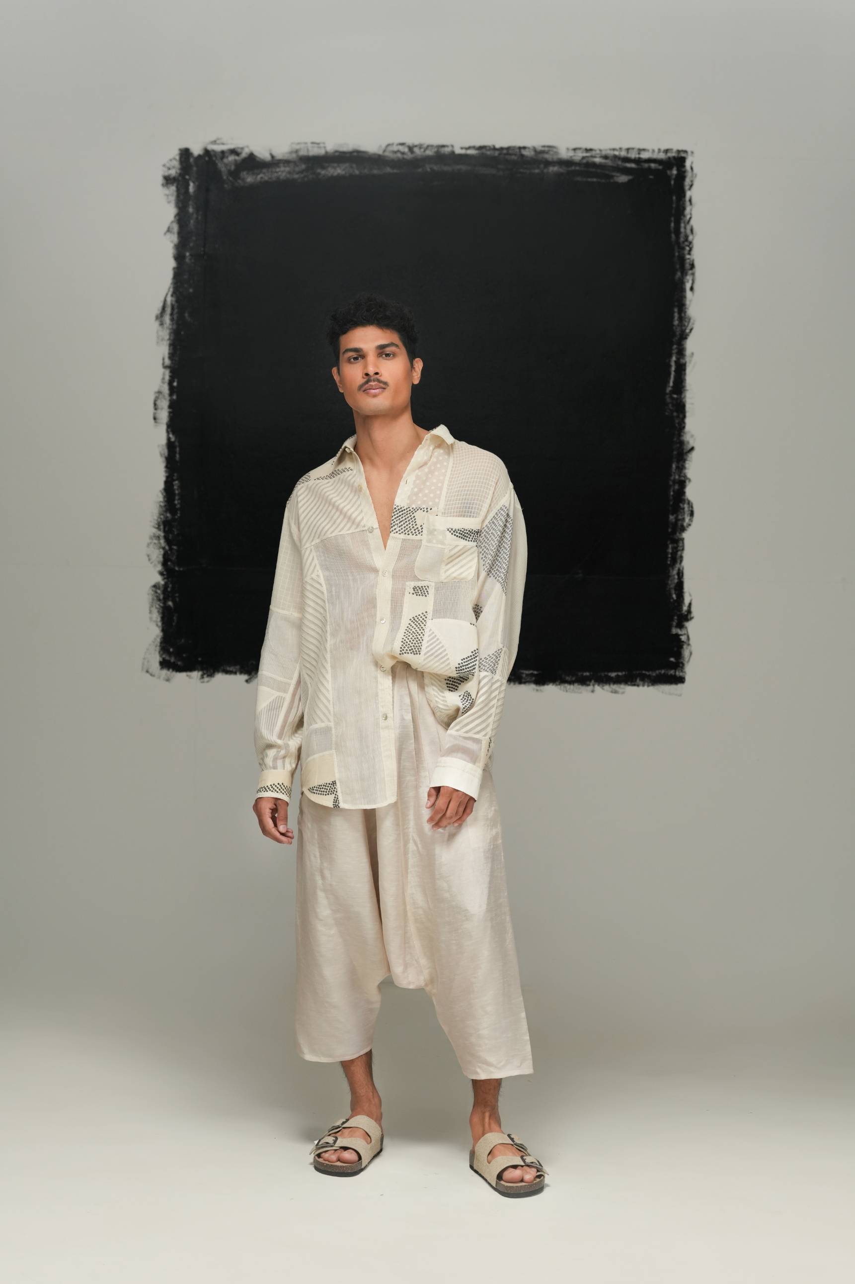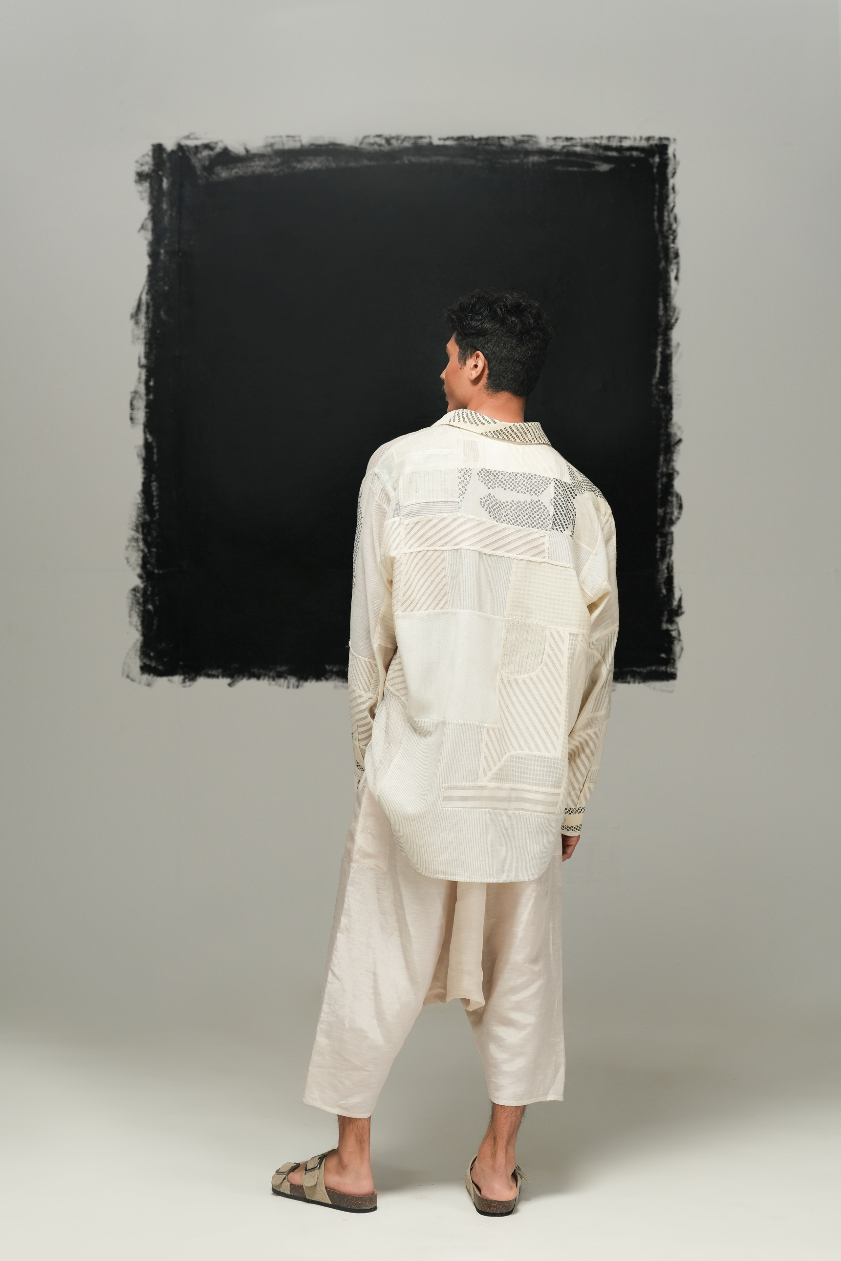 A shirt made with patchwork scraps, with the over-dyed fabric