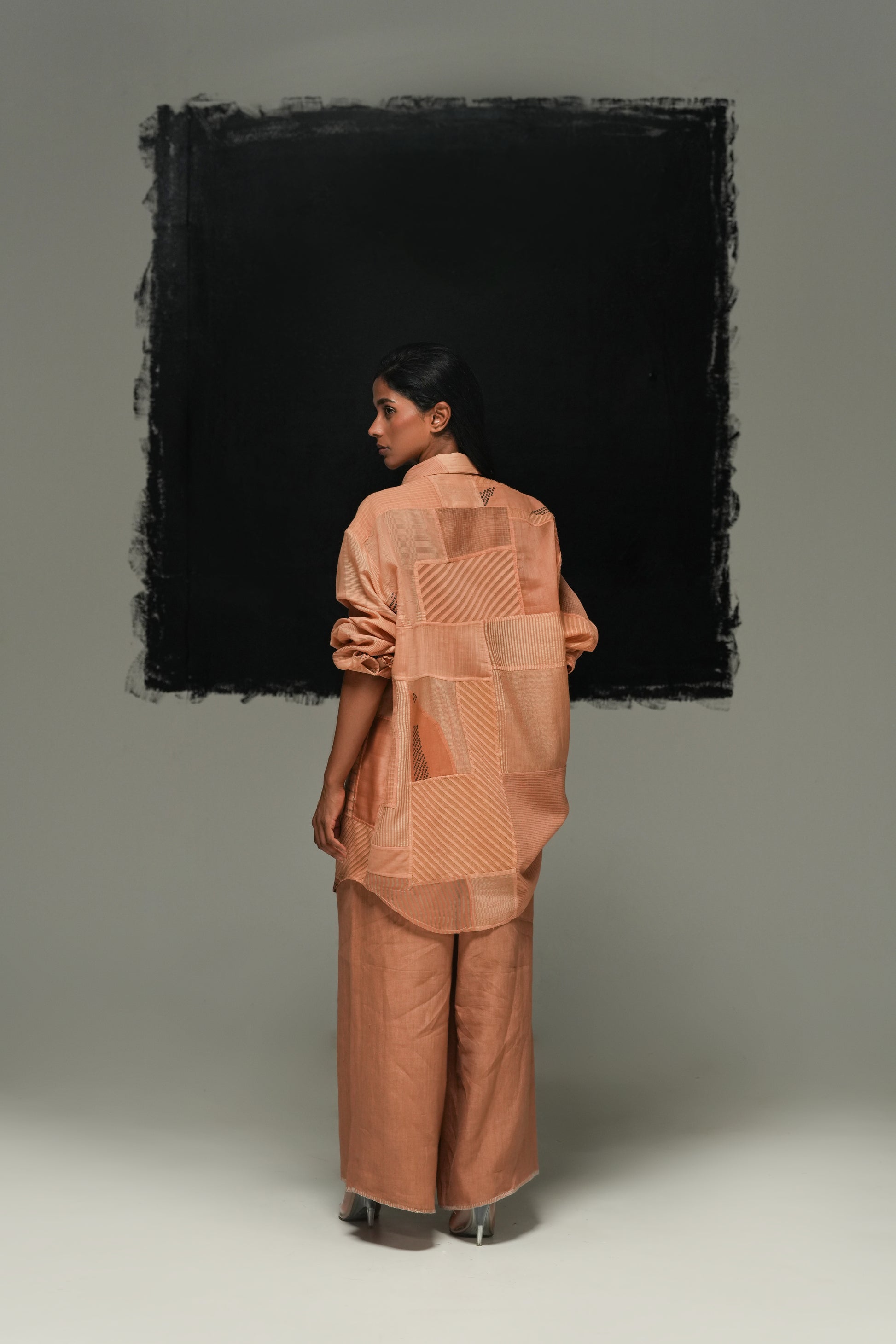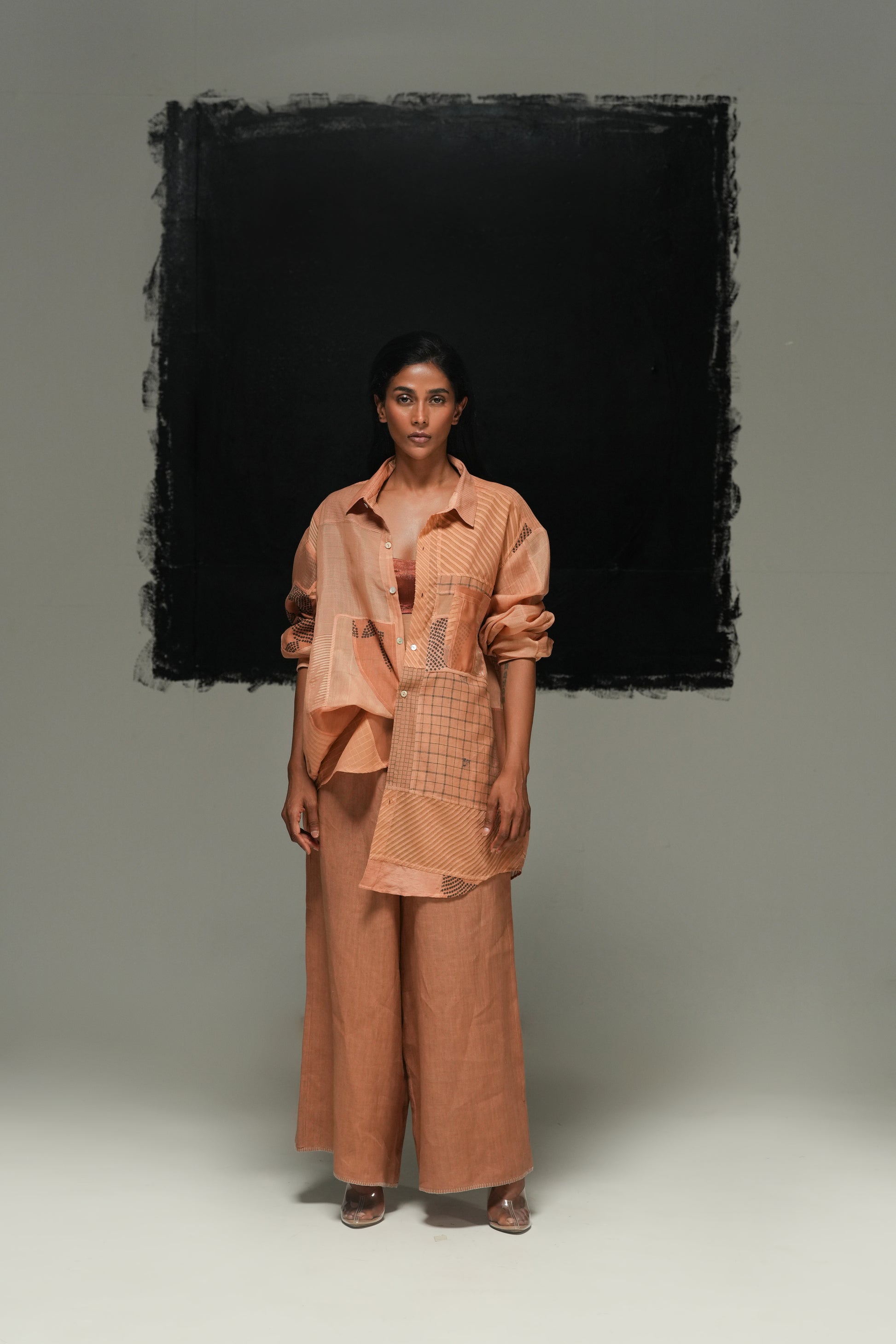 A shirt made with  patchwork scraps, with the over-dyed fabric.