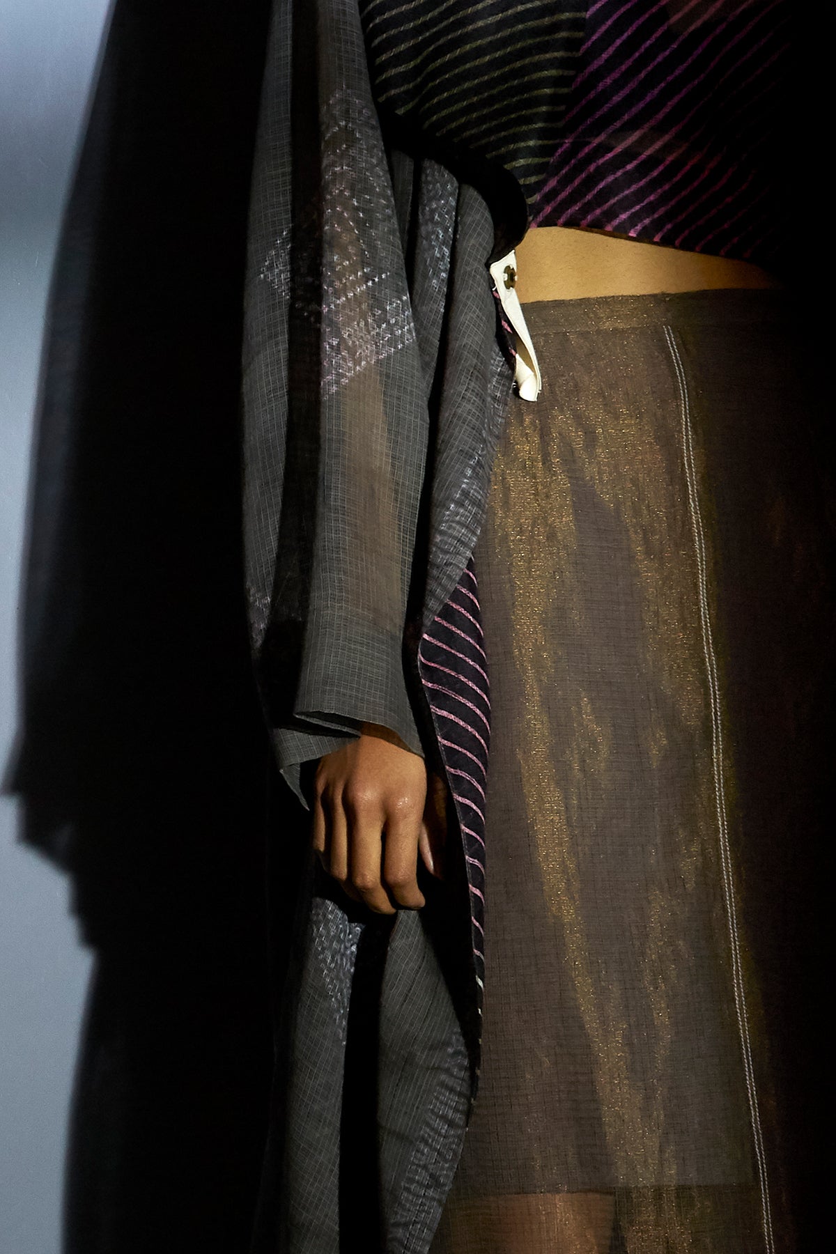 Style it with a leheriya printed crop top and an anti fit panelled jacket in shibori print