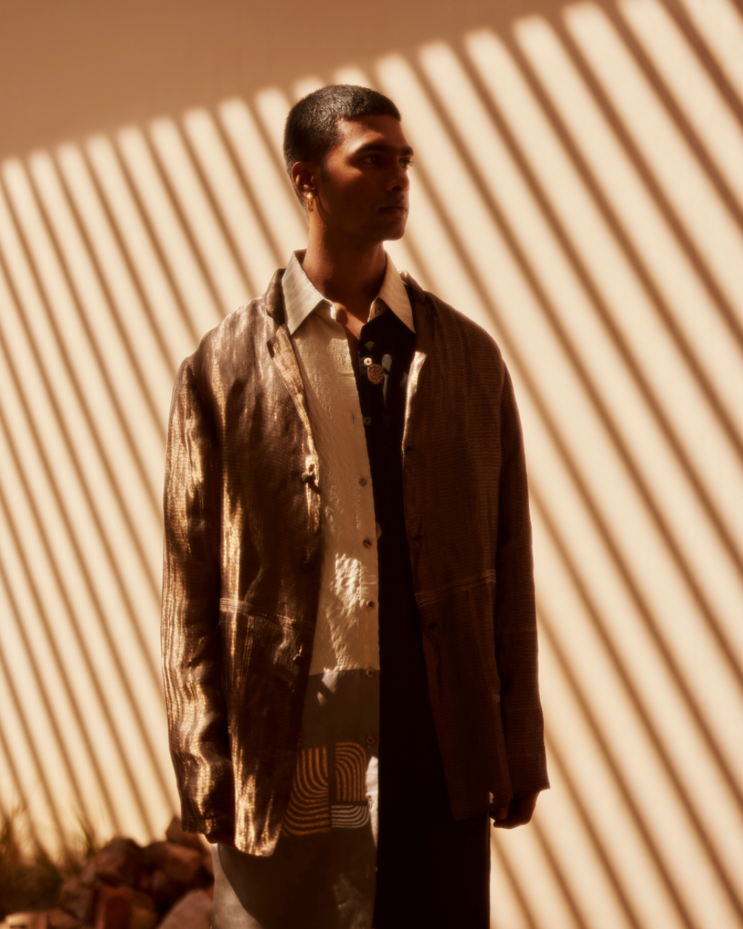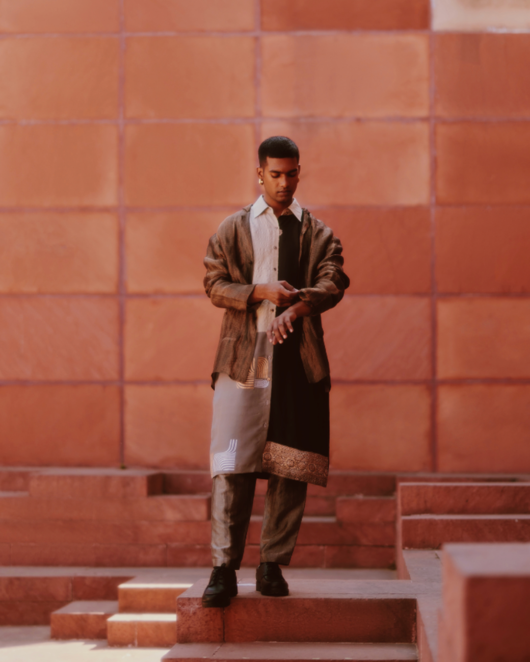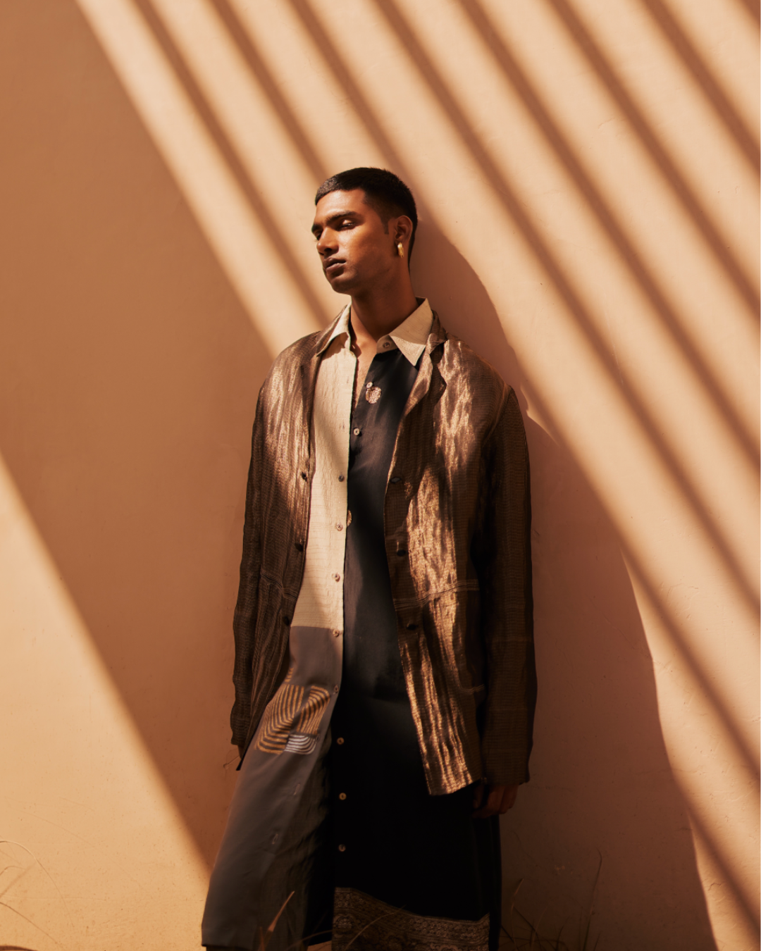 Blockprinted, full sleeve long-line shirt, patchworked in vintage brocade silk and chinese silk featuring gold zari stitch line details. Pair with our duro pants.