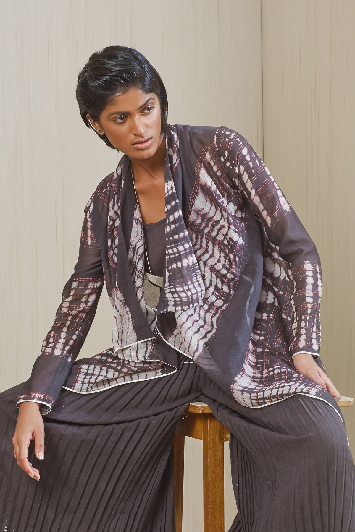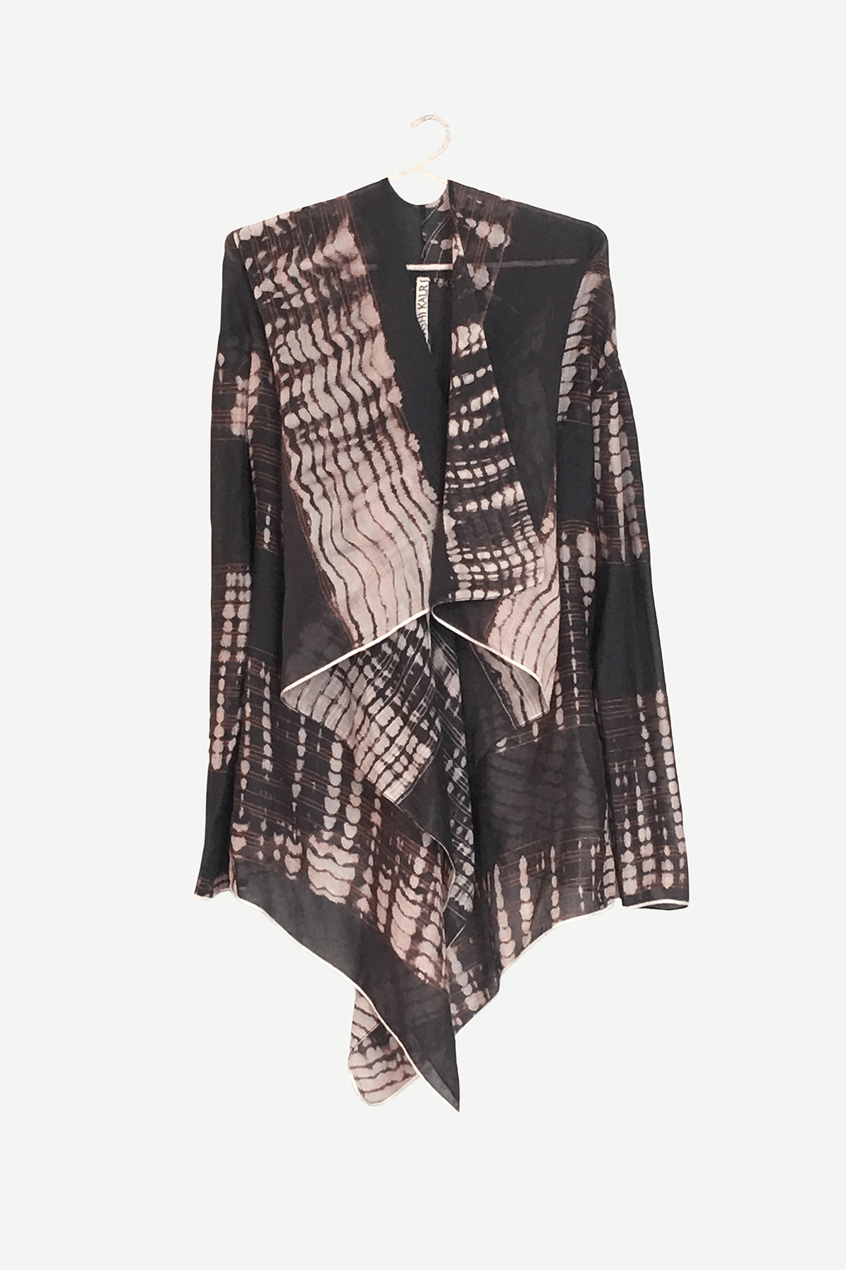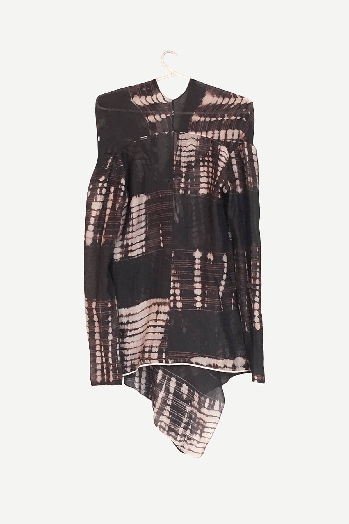 Flowy asymmetric overlay in tie and dye cotton silk with stitch line details adding texture wear over a dress or a relaxed top and wide pleated pants for an evening look