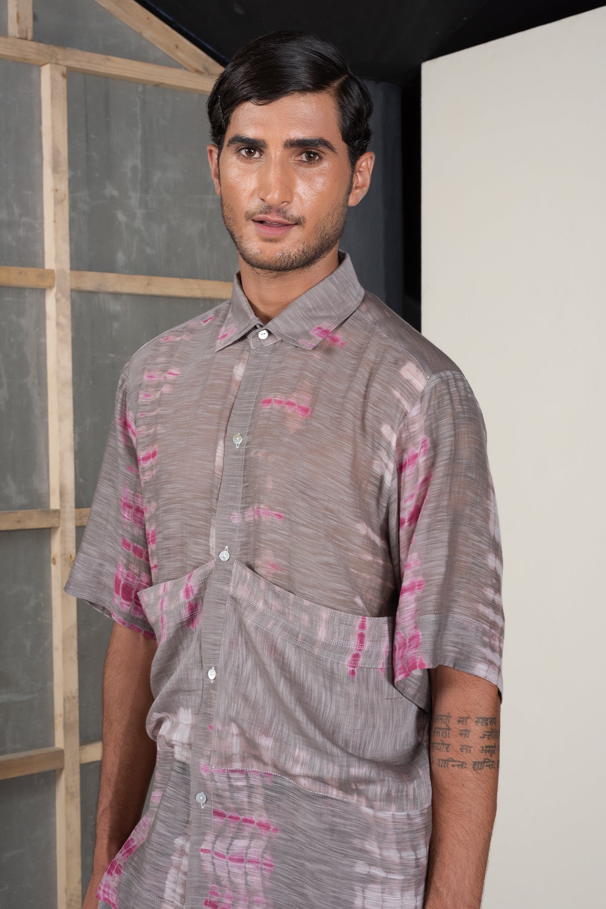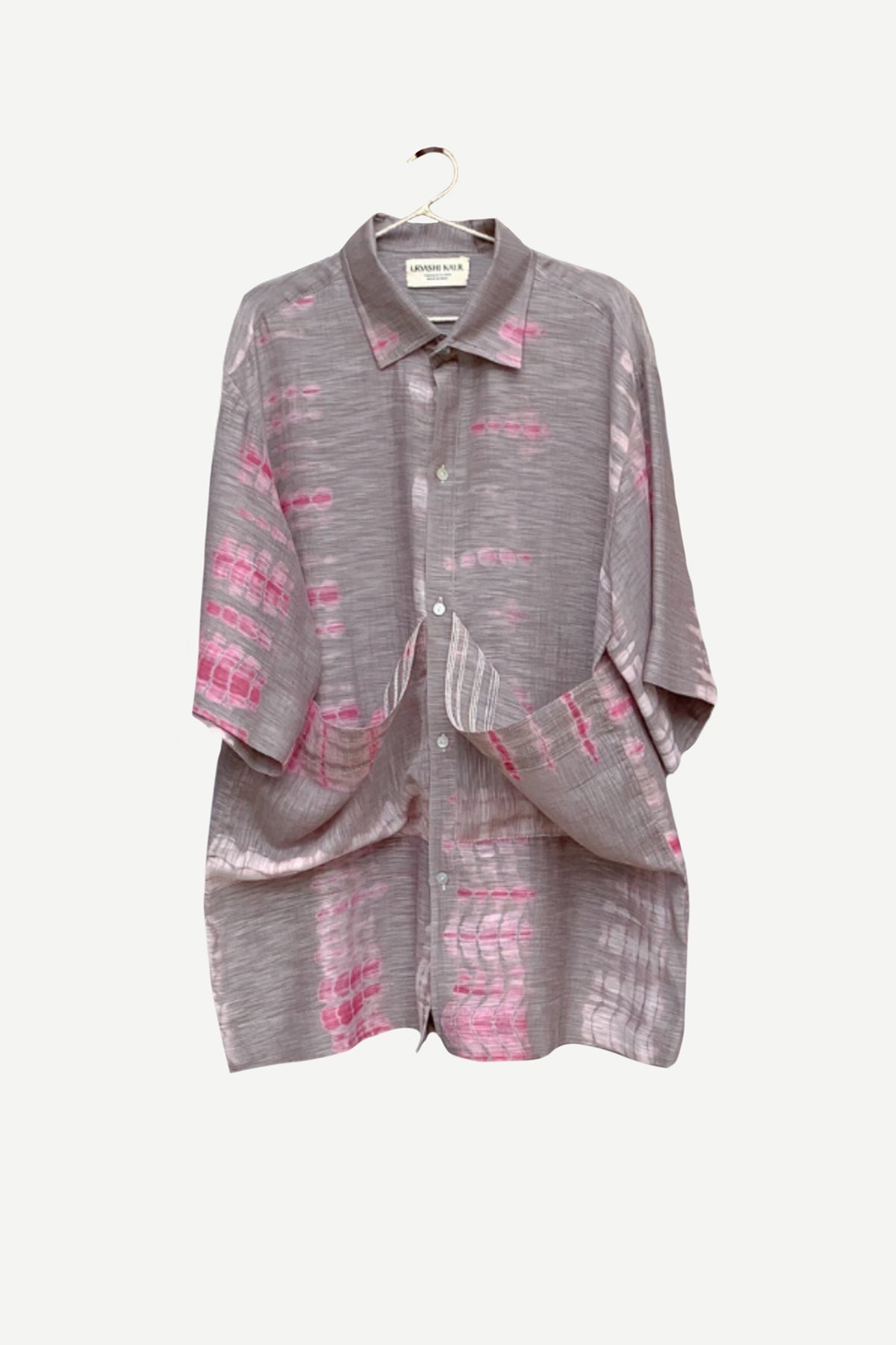 Button down shirt in hand tie and dye cotton silk with exaggerated pockets and stitch line details adding texture pair with contrasting or coordinating shorts and overlay