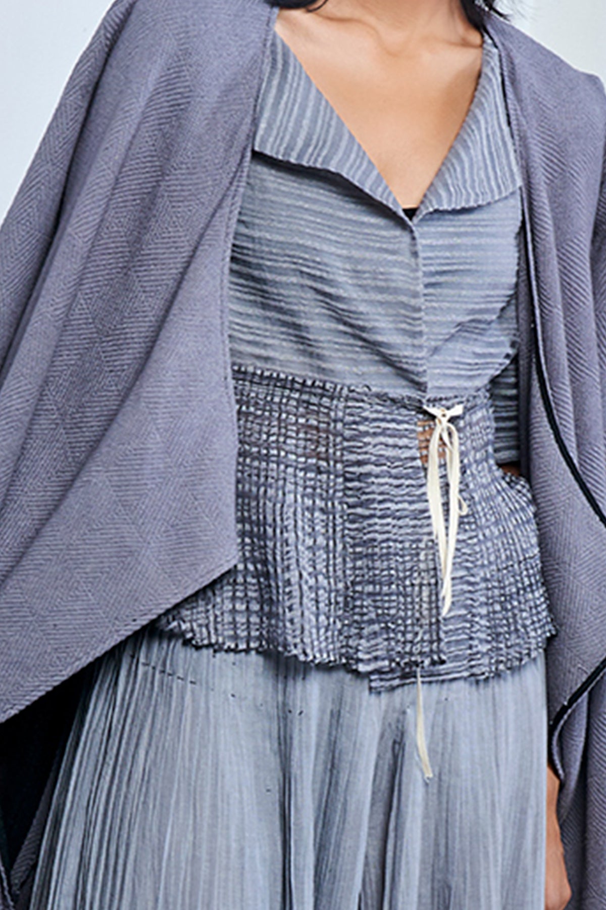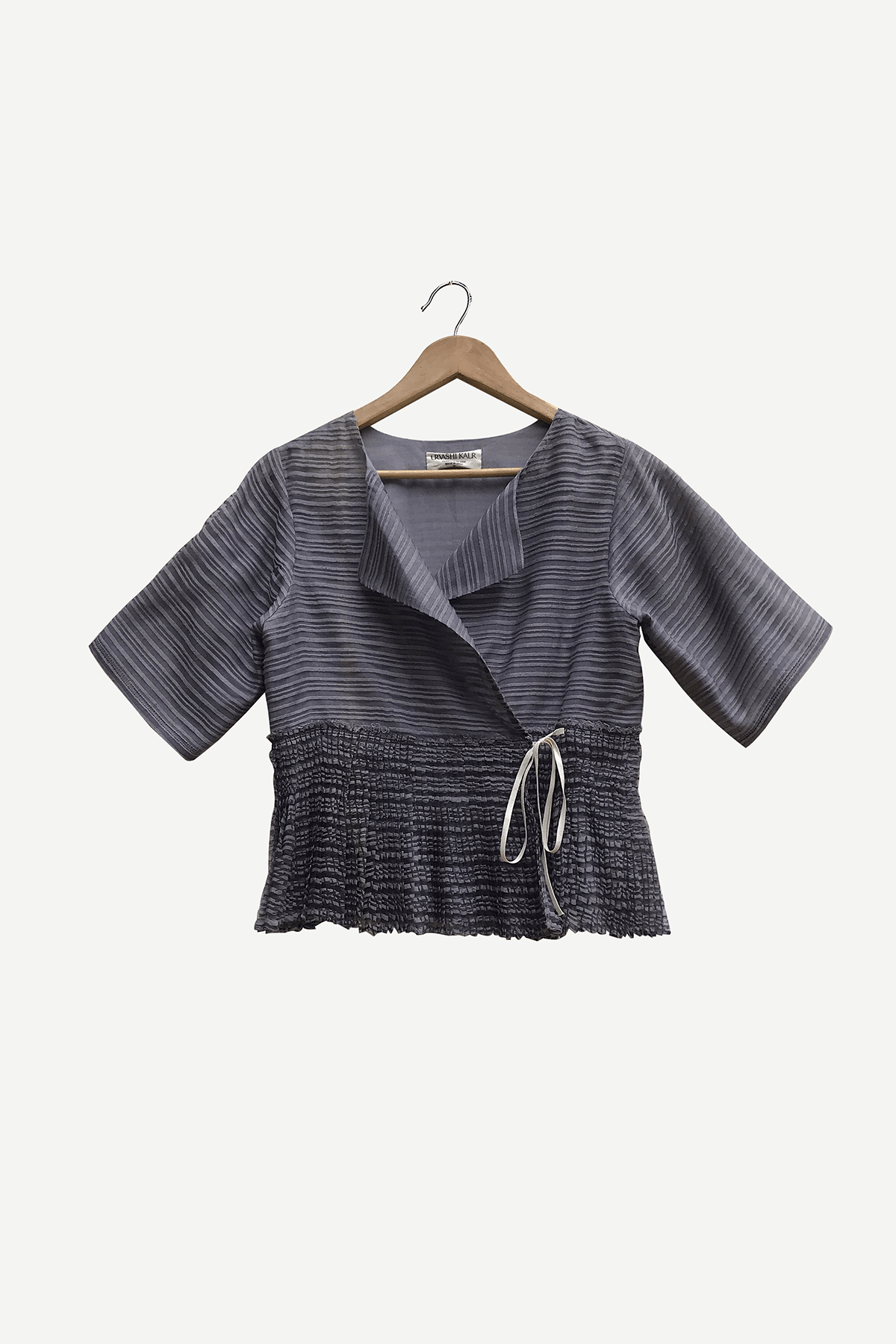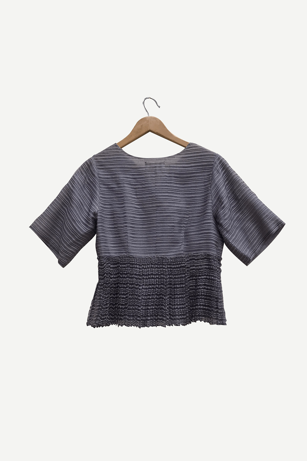 Blockprinted hand micropleated peplum in linen noil with kantha stitches holding the pleats wear with coordinated pleated pants to complete the look