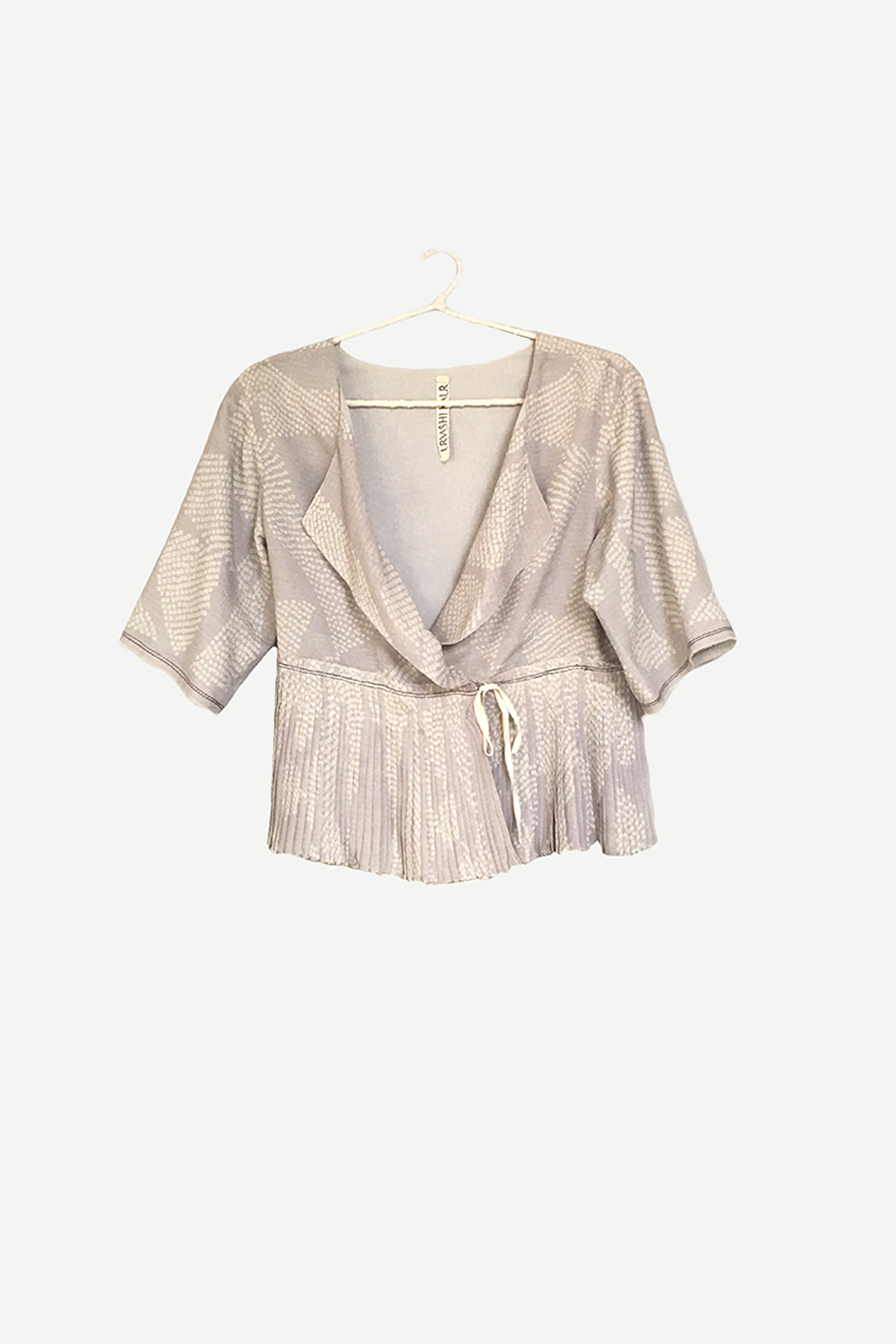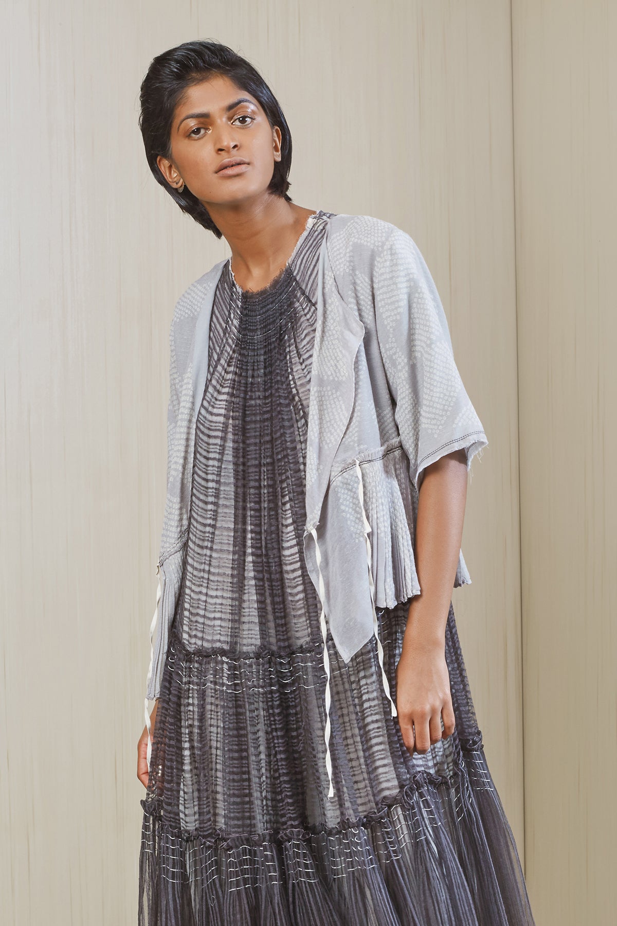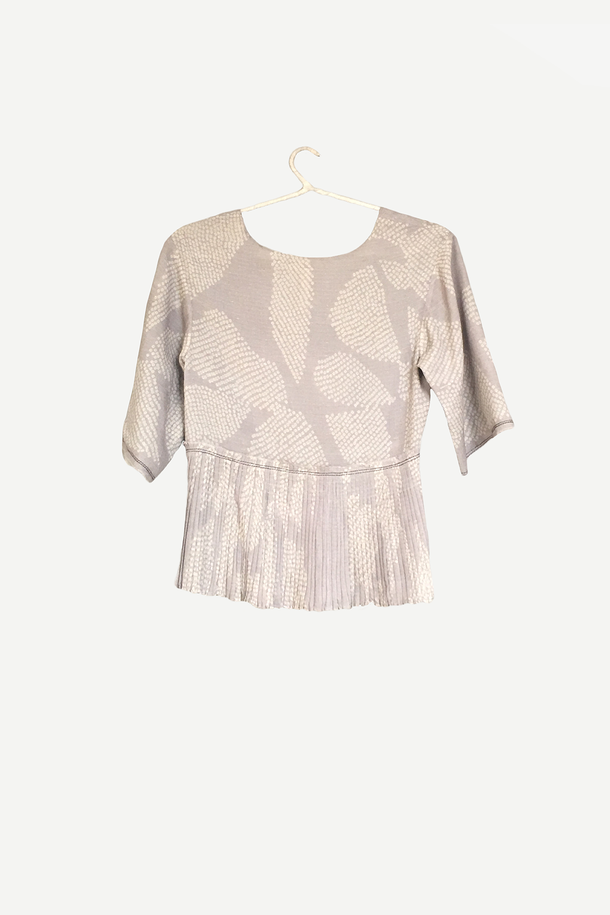 Hand micro pleated peplum top in shibori printed matka silk with kantha stitches holding the pleats