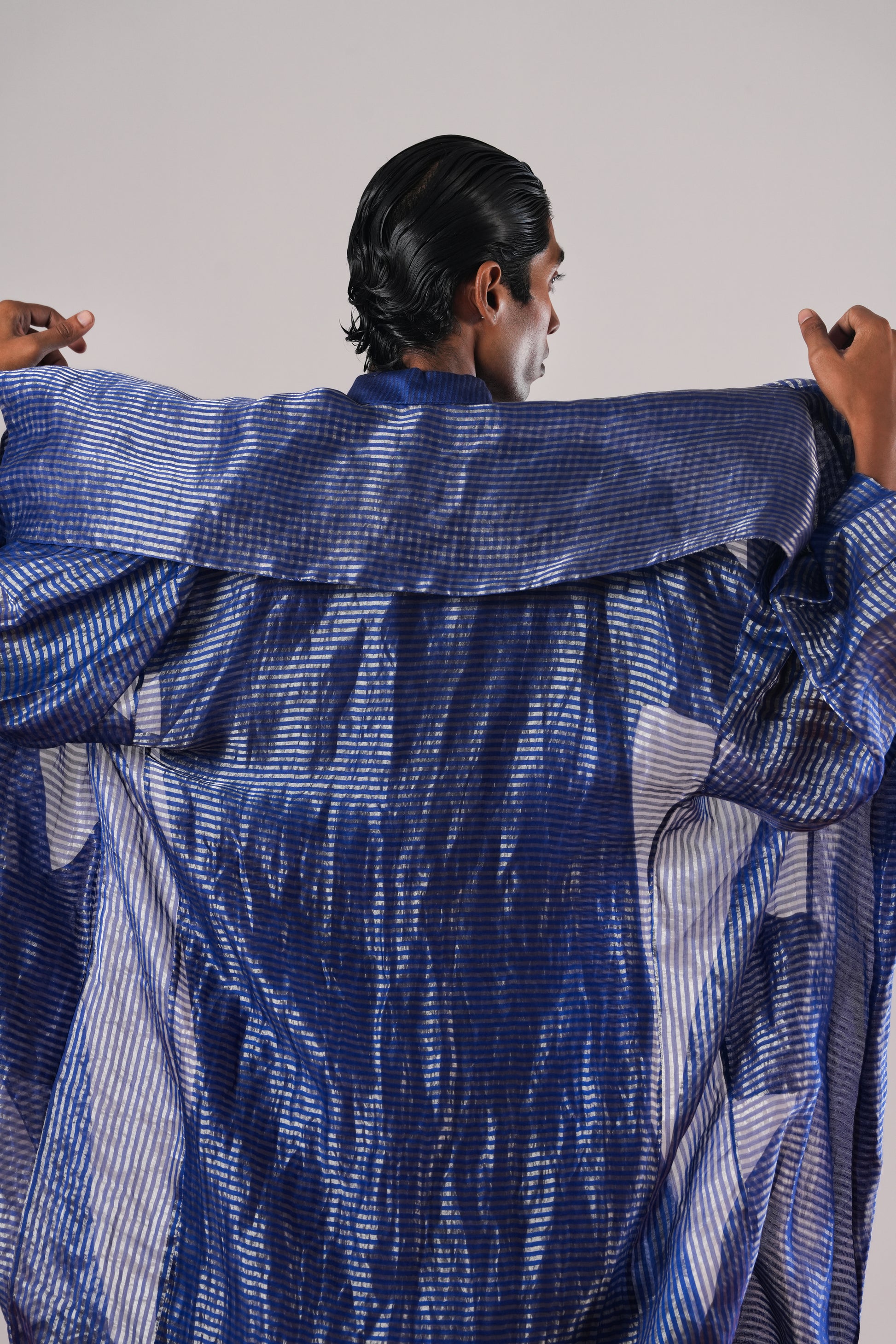 A relaxed long-line shirt dress in striped Chanderi silk, detailed with buttoned-down sleeves and a fluid silhouette that moves with ease. Subtle yet statement-making, it captures the nd’s ethos of effortless layering.