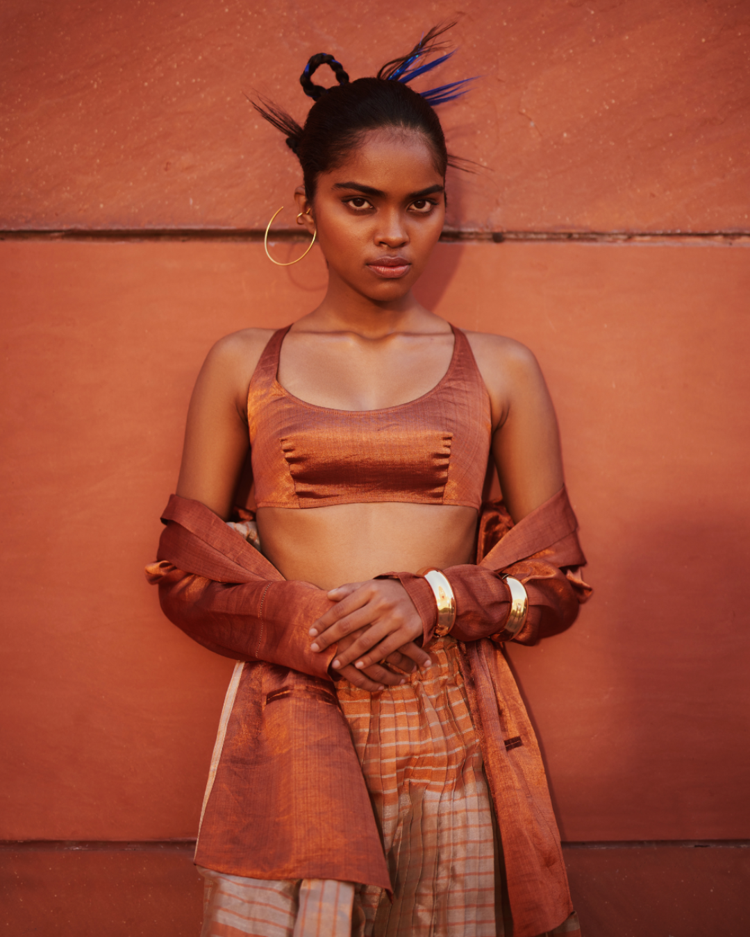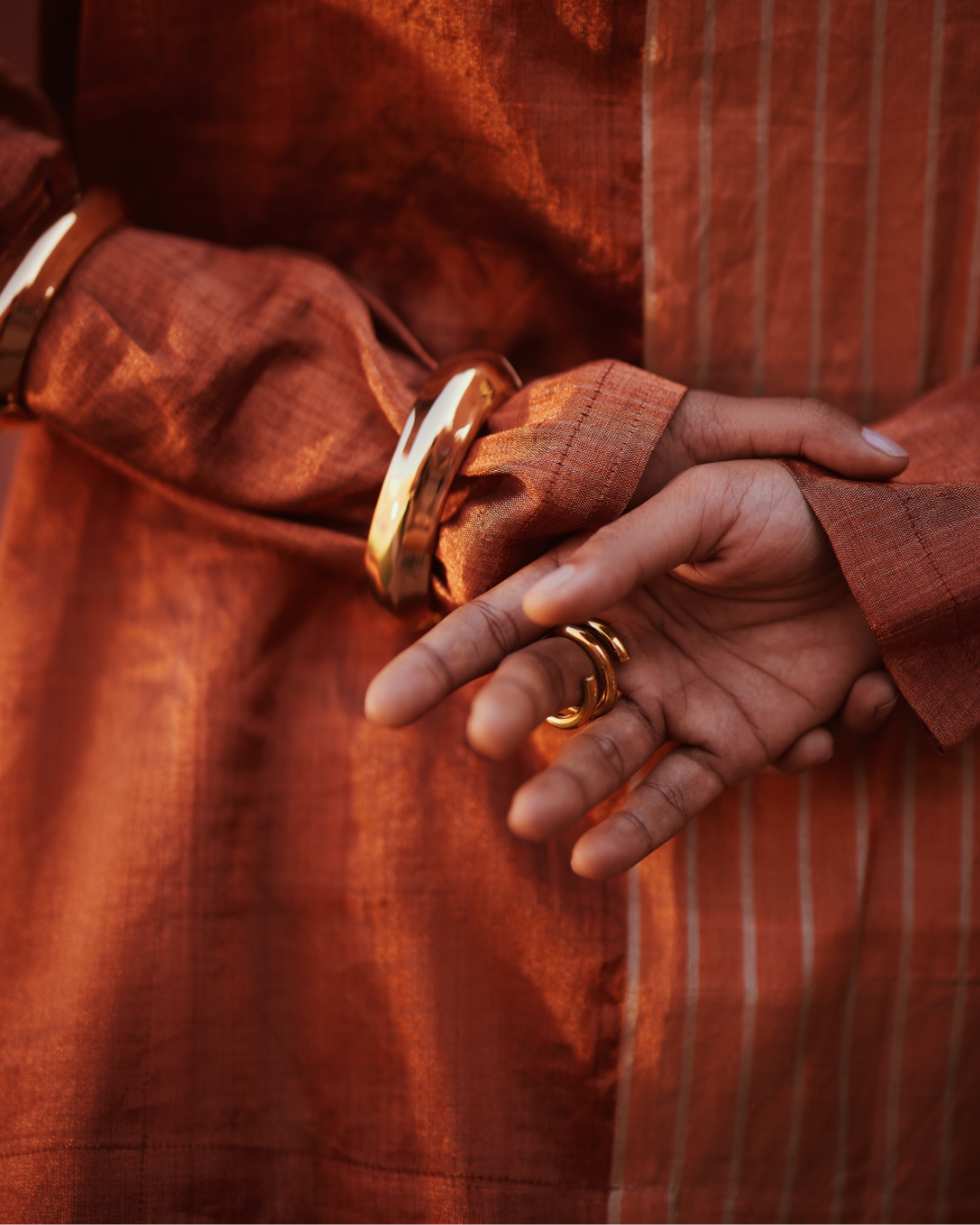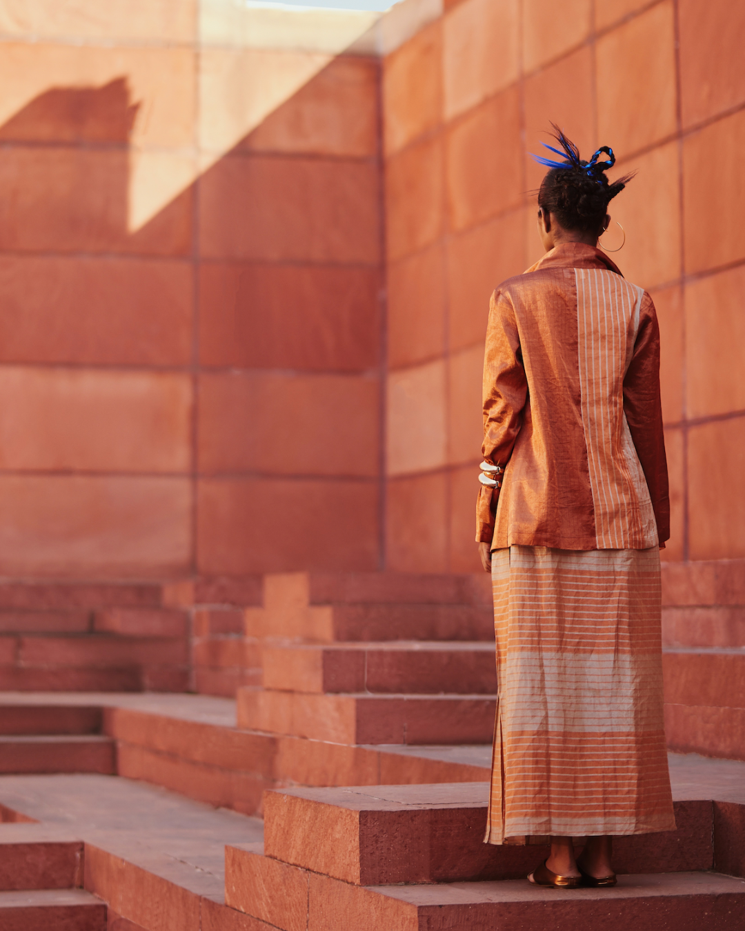 Structured overcoat in handwoven tissue silk. Layer it over our dash blazer and amari skirt for chic look