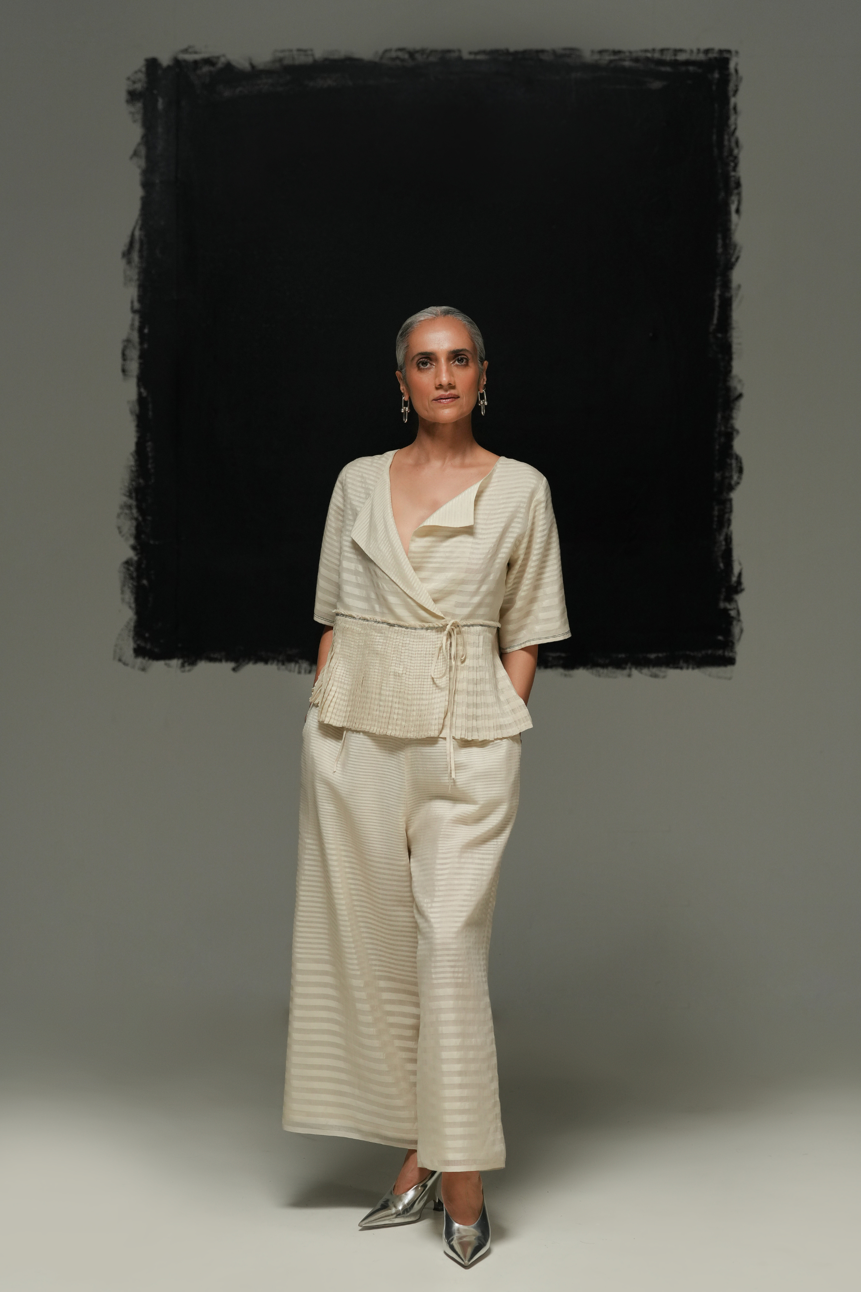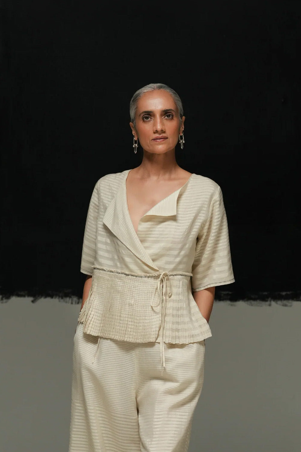 Hand micropleated wrap peplum top in handwoven maheshwari silk with kantha stitches holding the pleats.