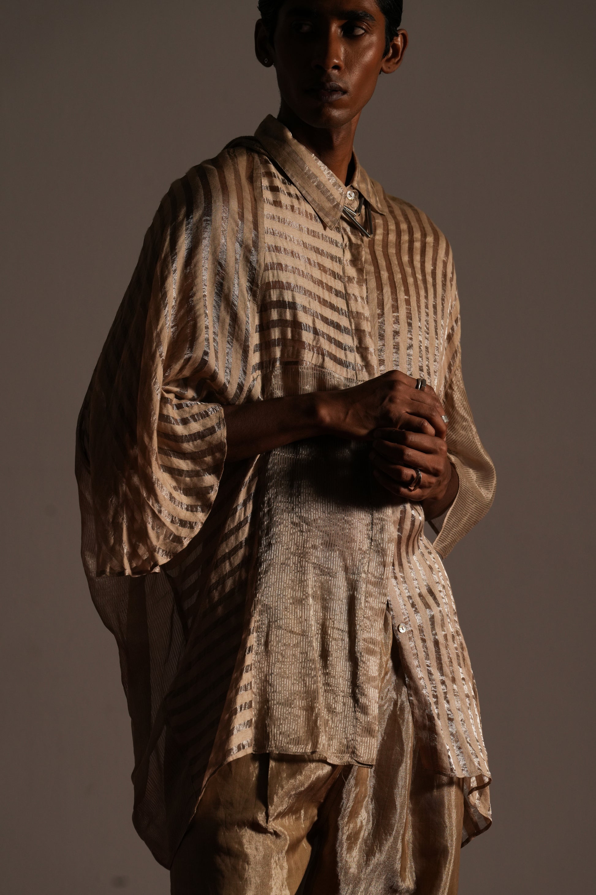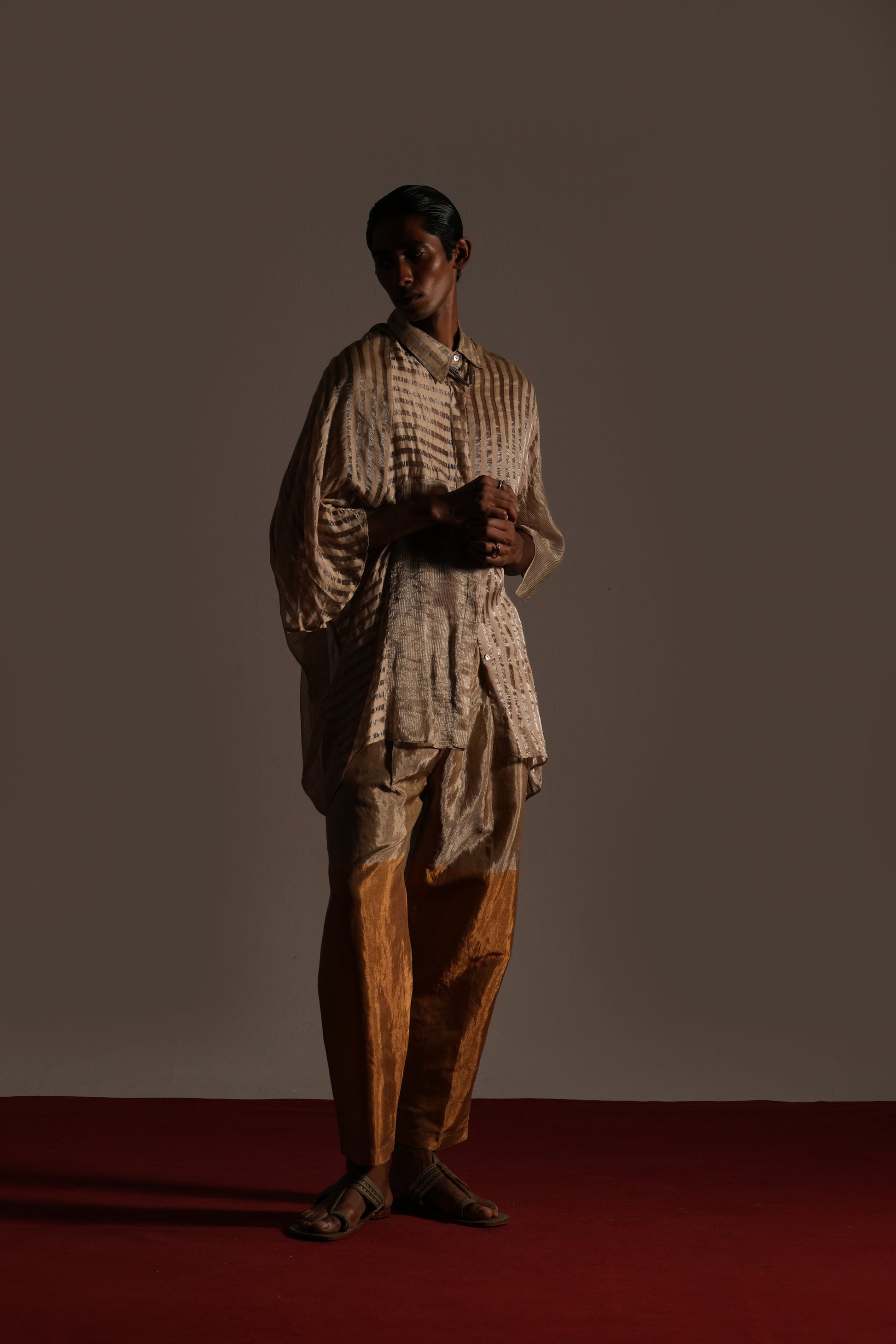 Relaxed straight-fit pants in handwoven striped silk, designed for versatility and ease.