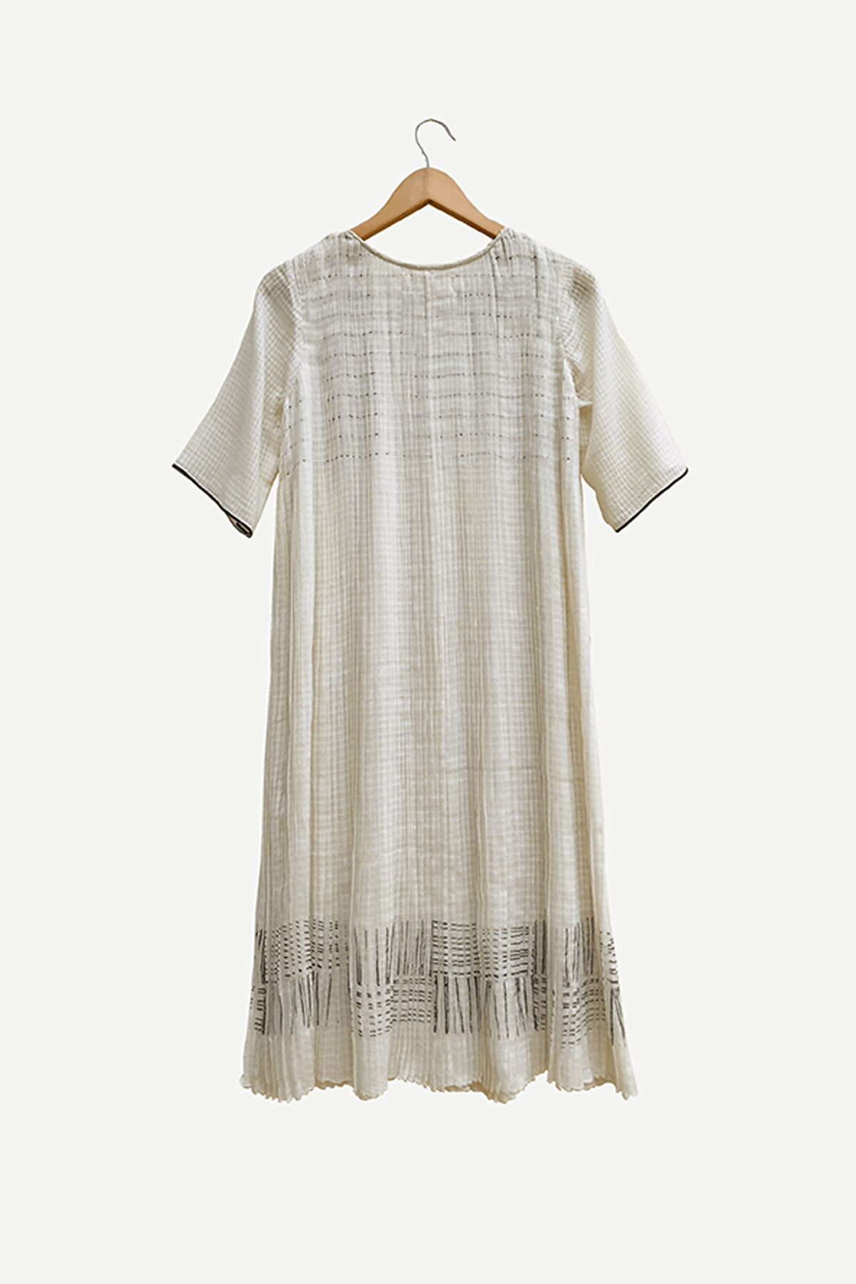 Blockprinted hand micro pleated dress in cotton with kantha stitches holding the pleats