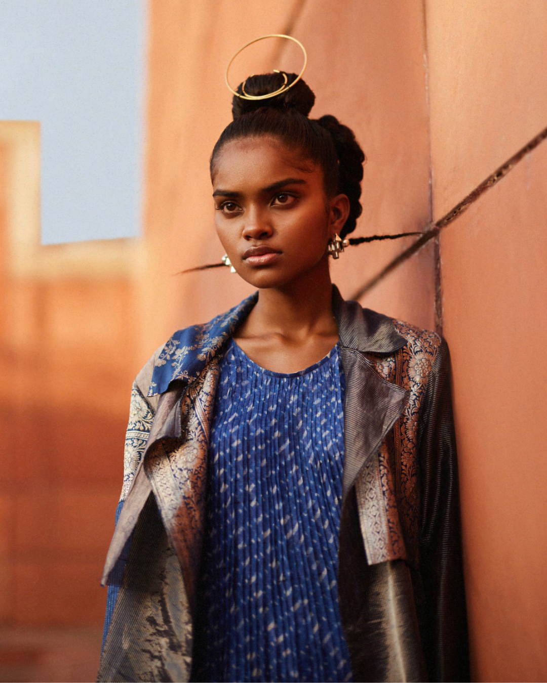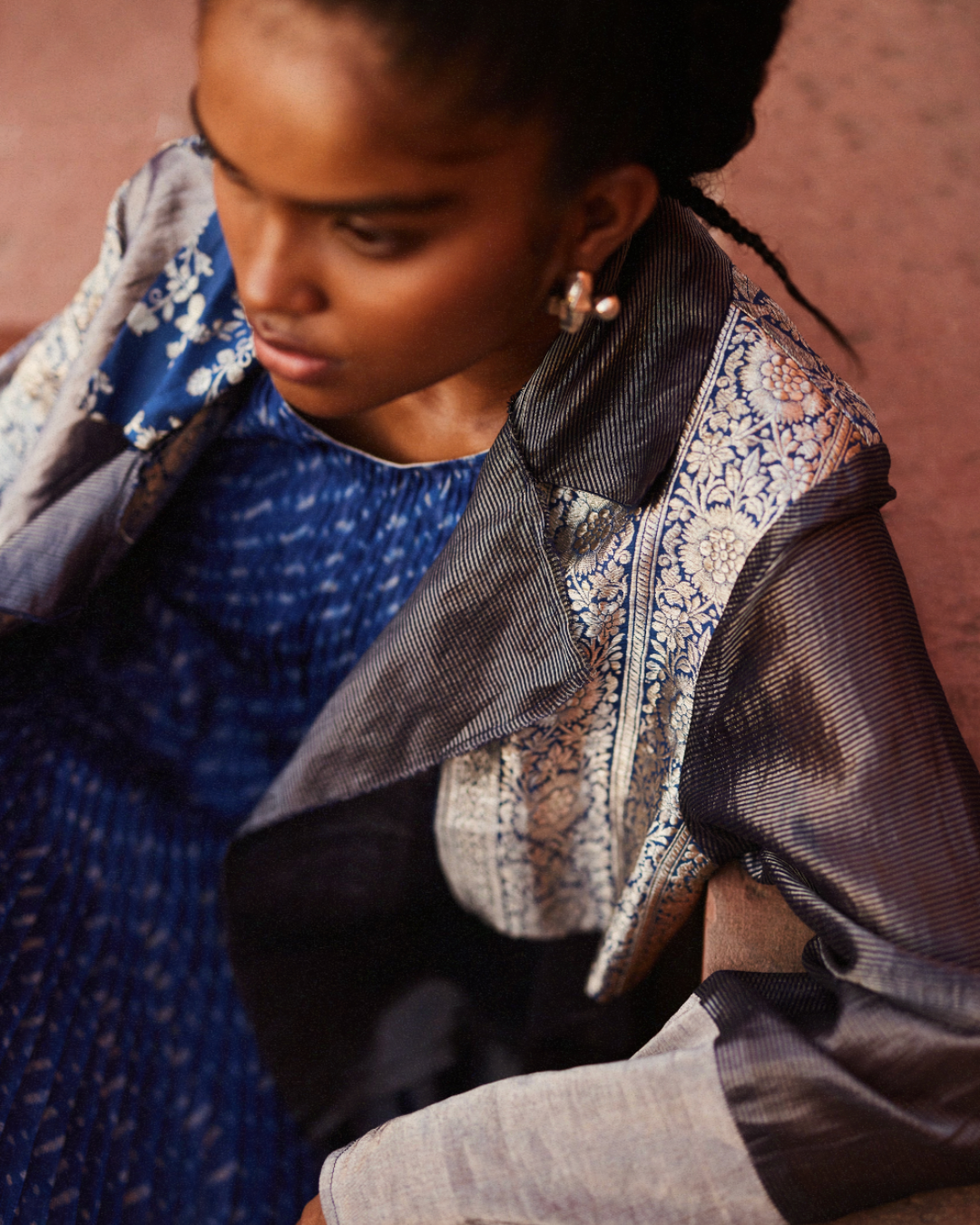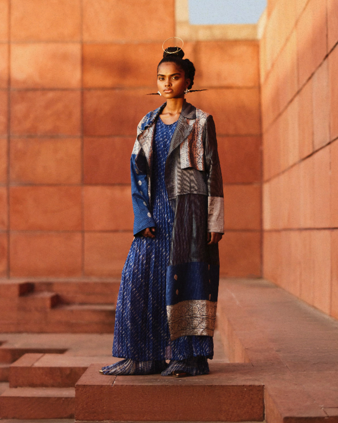 Hand micropleated dress in handwoven zari kota doria with kantha stitches holding the pleats. Wear solo or style with our Heiko pants and Demi jacket to complete the monochrome look
