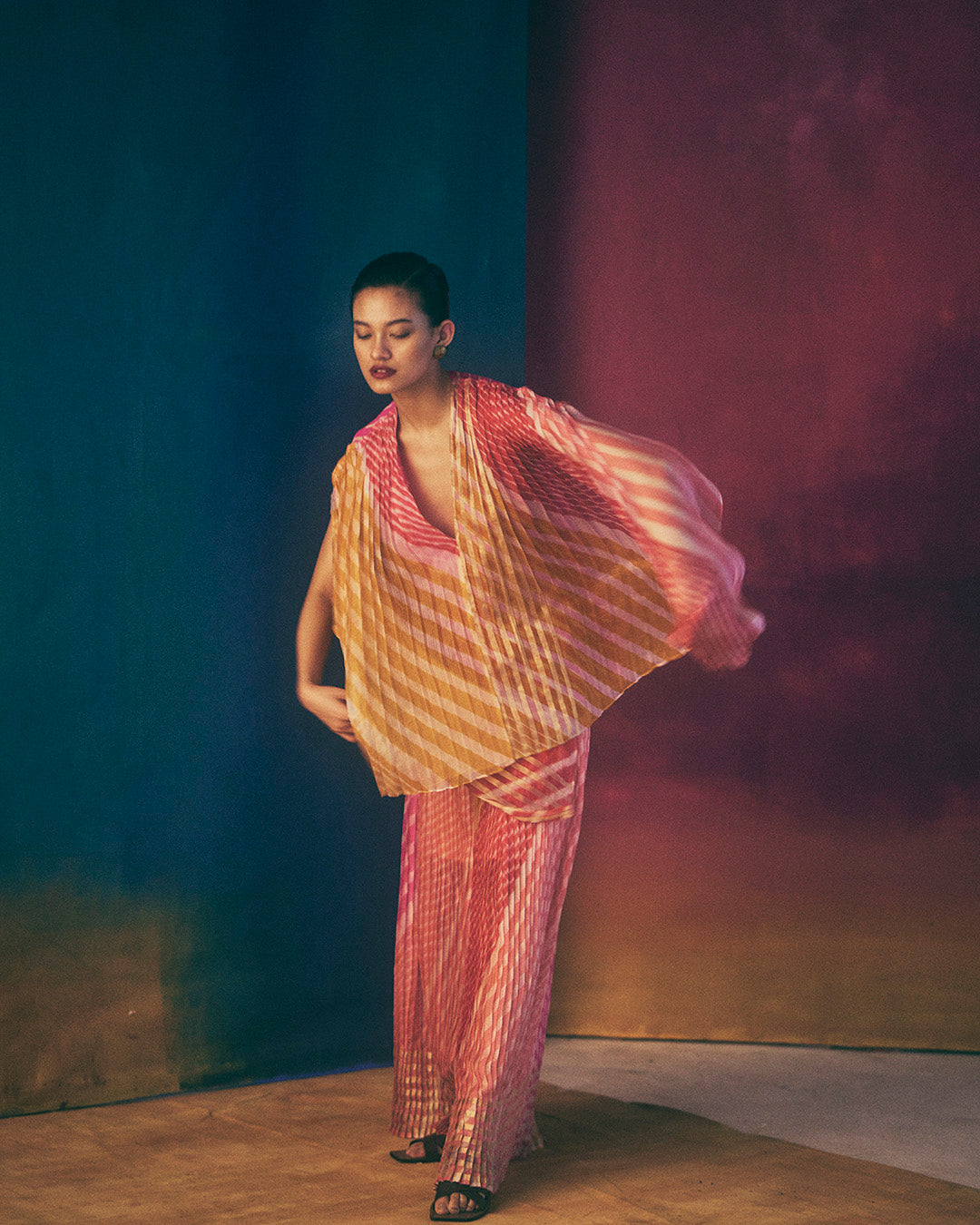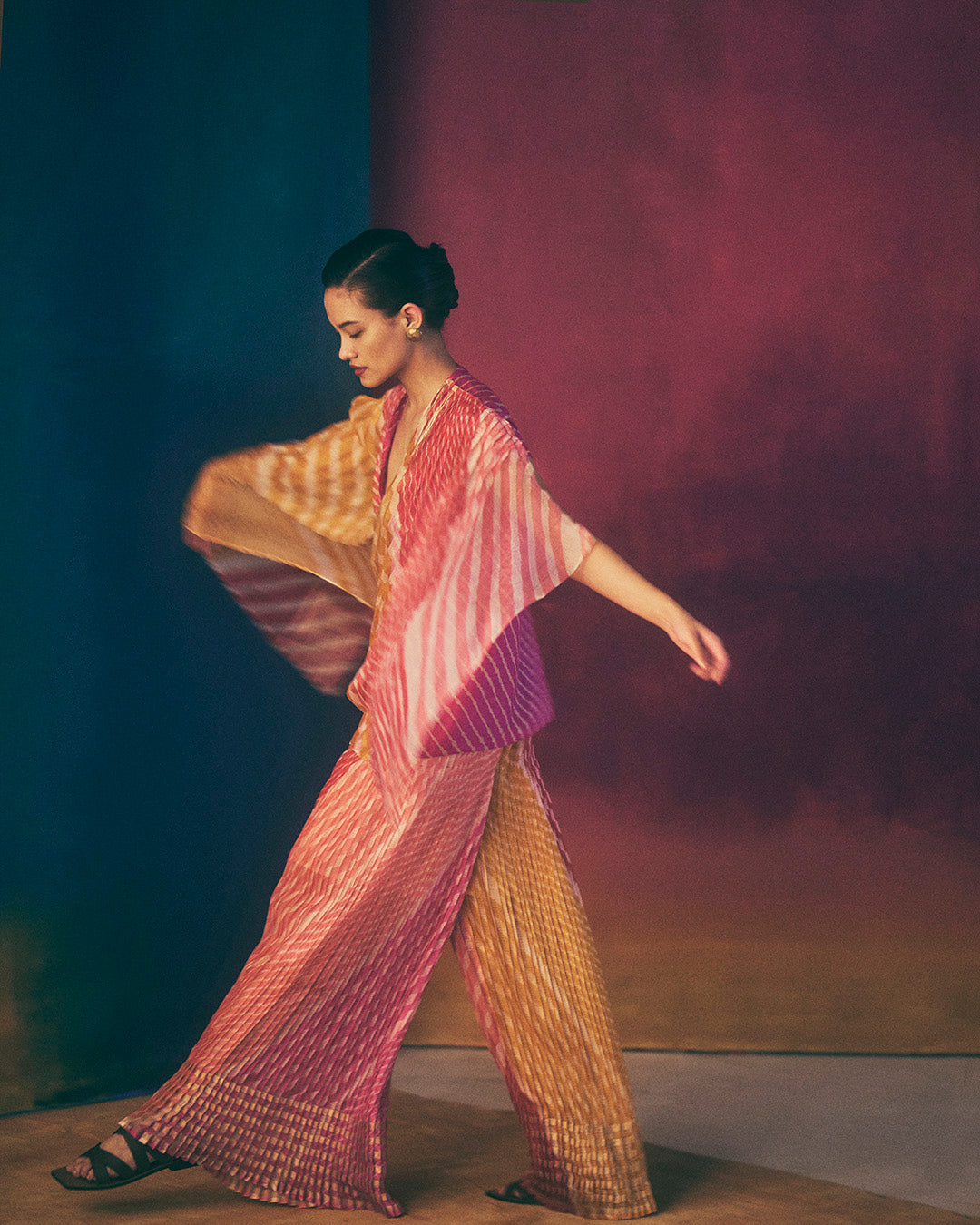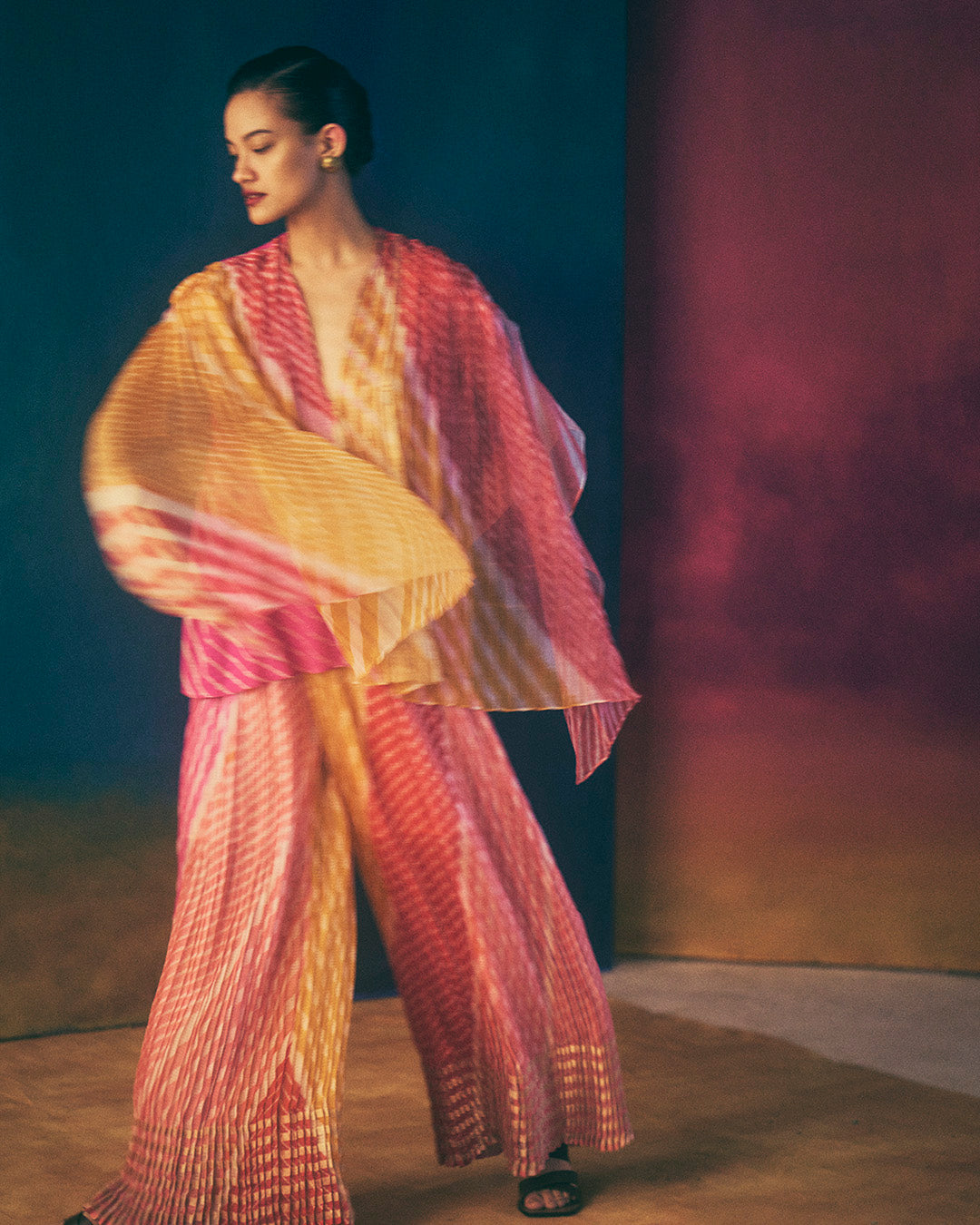 Hand micro-pleated wide pants in hand tie dyed leheriya in zari silk kota doria with kantha stitches holding the pleats